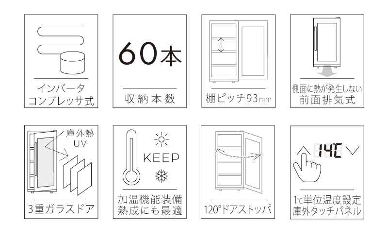 温度に応じ回転数を制御することにより高効率で運転するインバータコンプレッサ搭載。運転時間を少なく抑えられるので、運転時に発生する振動も最小限に抑えられます。庫内温度の変動を小さく抑えられるため、庫内のワインなどの飲料の液体温度の変動も小さい、より安定したワインの熟成にも最適な環境を実現。省エネにも優れています。