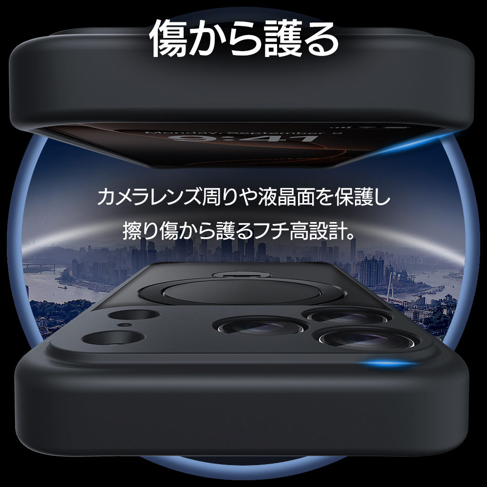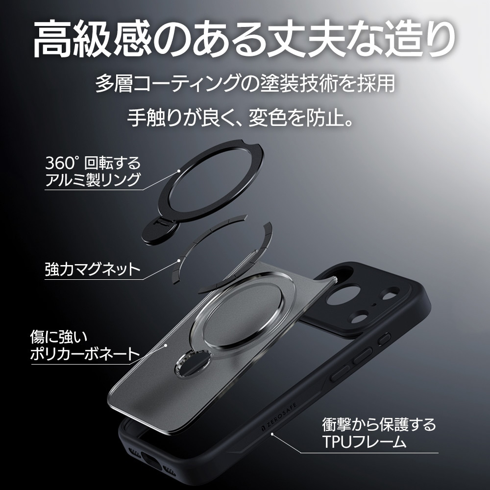 ●指が通せて操作安心、360度回転でお好みの角度に調整可能な、MagSafe対応リング付き。使用しない時はスリムに収まります。※背面のリングを使用する際は必ず端末とケースを一緒に手に持ってください。リングのみを持って宙づりにしたり、振り回す等の行為はしないでください。端末の落下や本製品の破損の原因となります。