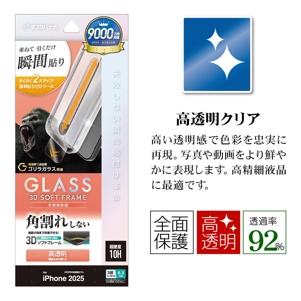 iPhone 17 Proフィルム 貼付革命 ソフトフレーム ゴリラガラス 光沢