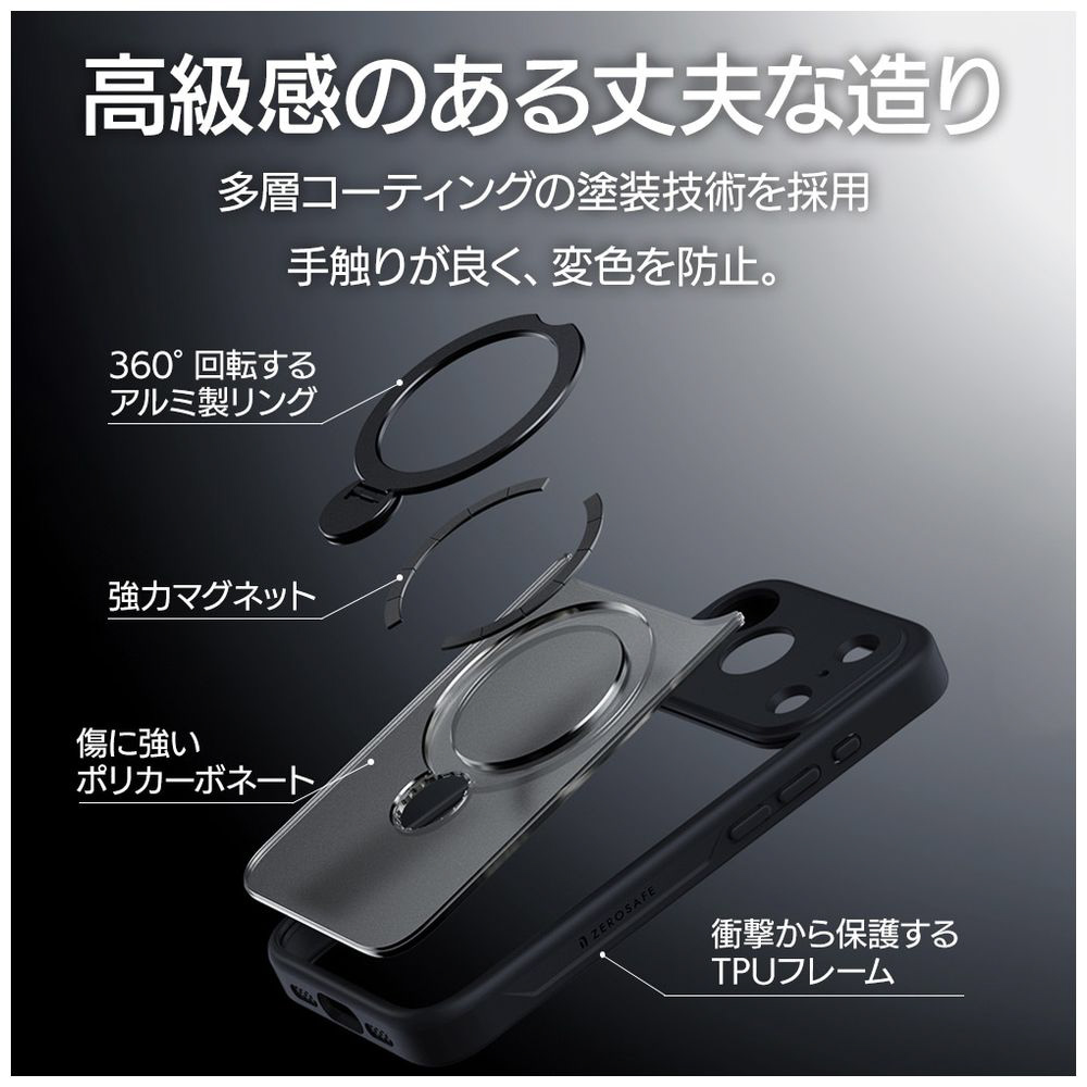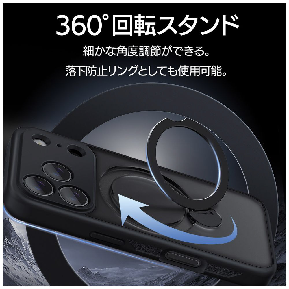 ●指が通せて操作安心、360度回転でお好みの角度に調整可能な、MagSafe対応リング付き。使用しない時はスリムに収まります。※背面のリングを使用する際は必ず端末とケースを一緒に手に持ってください。リングのみを持って宙づりにしたり、振り回す等の行為はしないでください。端末の落下や本製品の破損の原因となります。