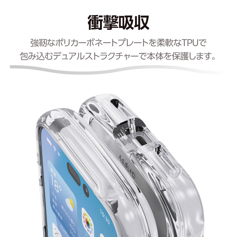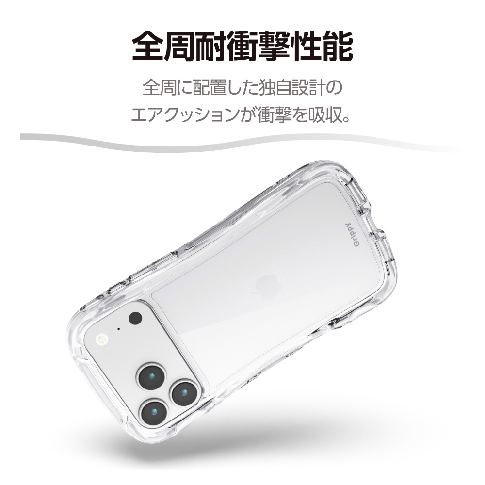 全周に配置した独自設計のエアークッションが衝撃を吸収し、背面には高硬度のポリカーボネート素材を採用。中央のくびれ形状に平坦な面を設けることで、手に馴染む快適なグリップ感を実現したGrippyシリーズのハイブリッドケースです。端末のデザインが美しく際立つオールクリアタイプです。
