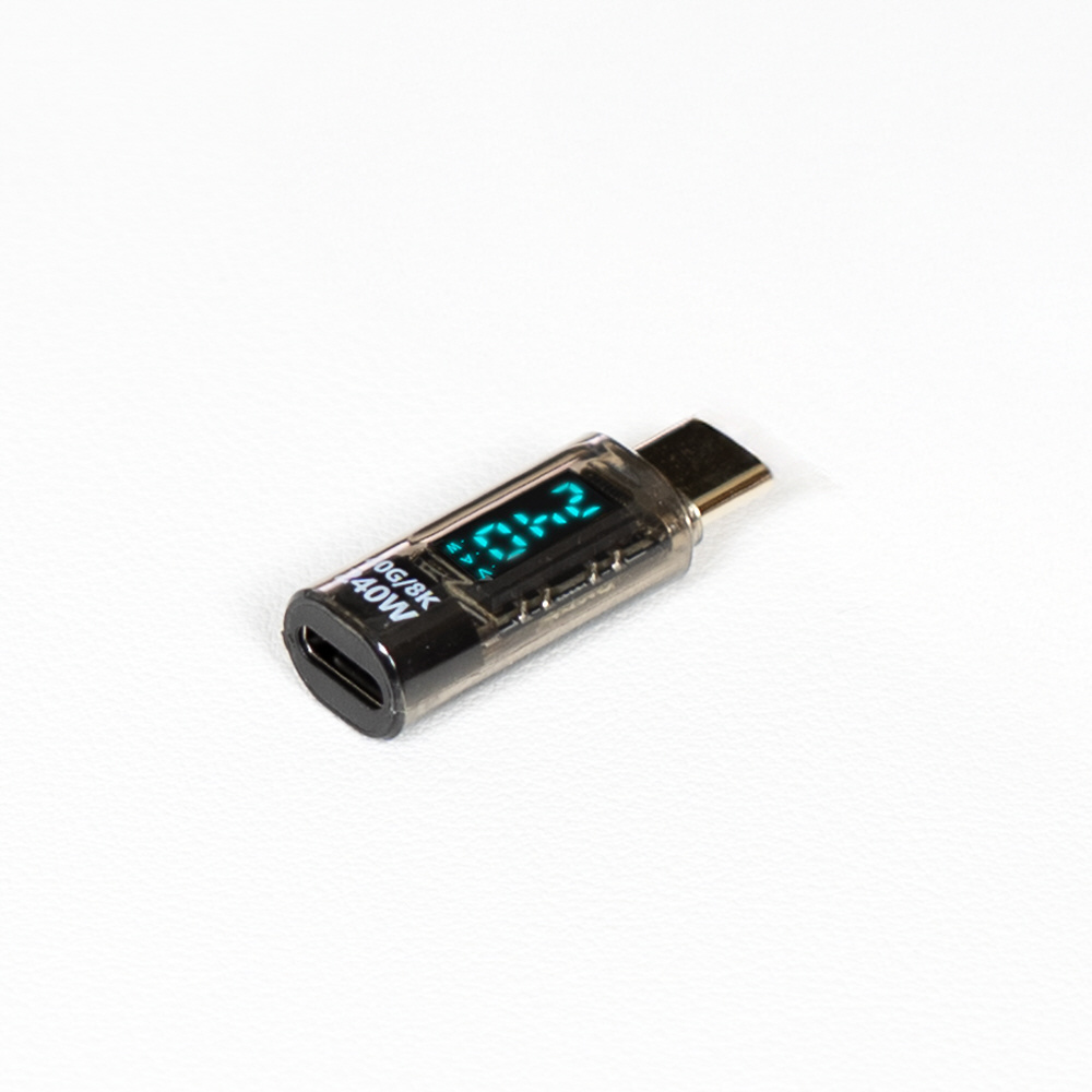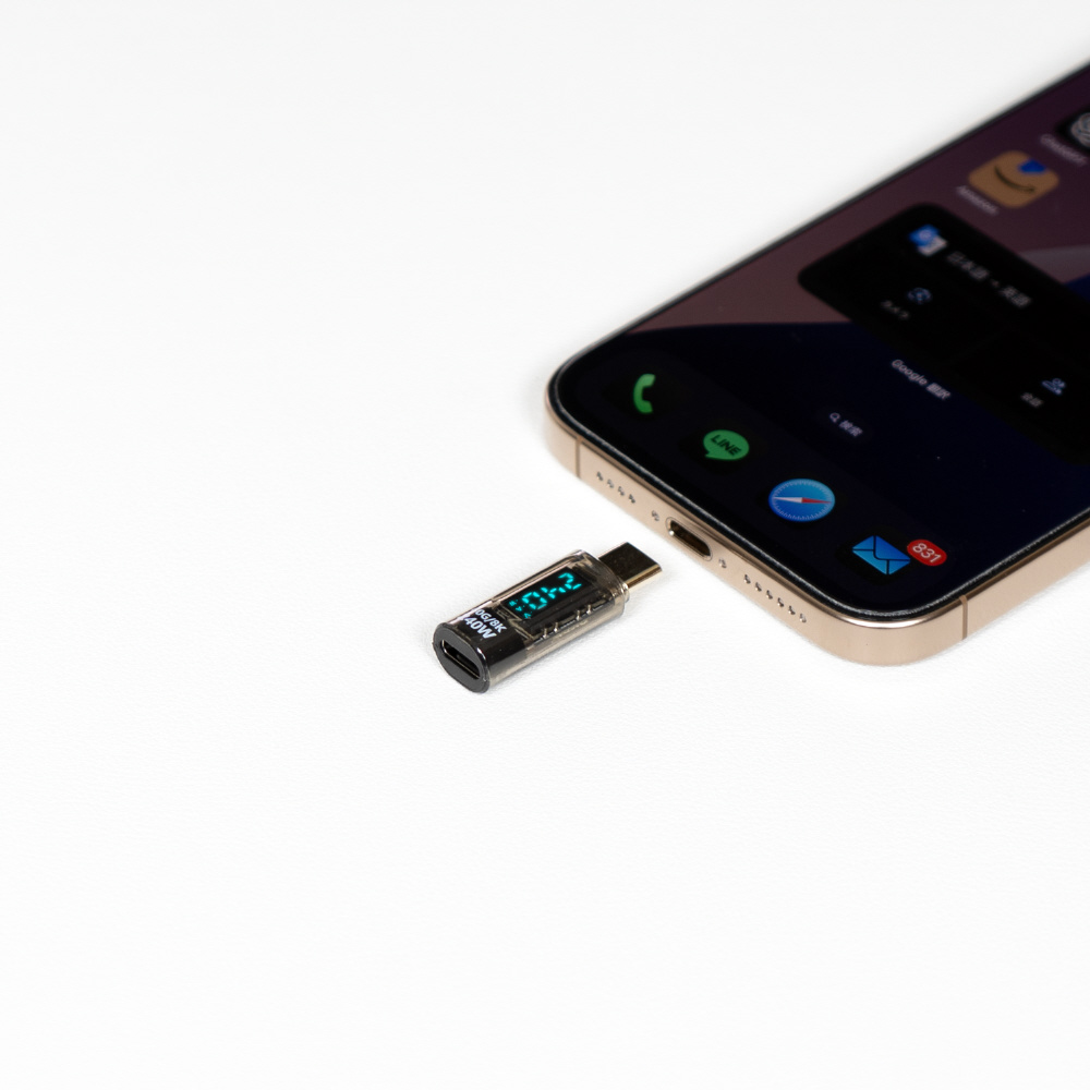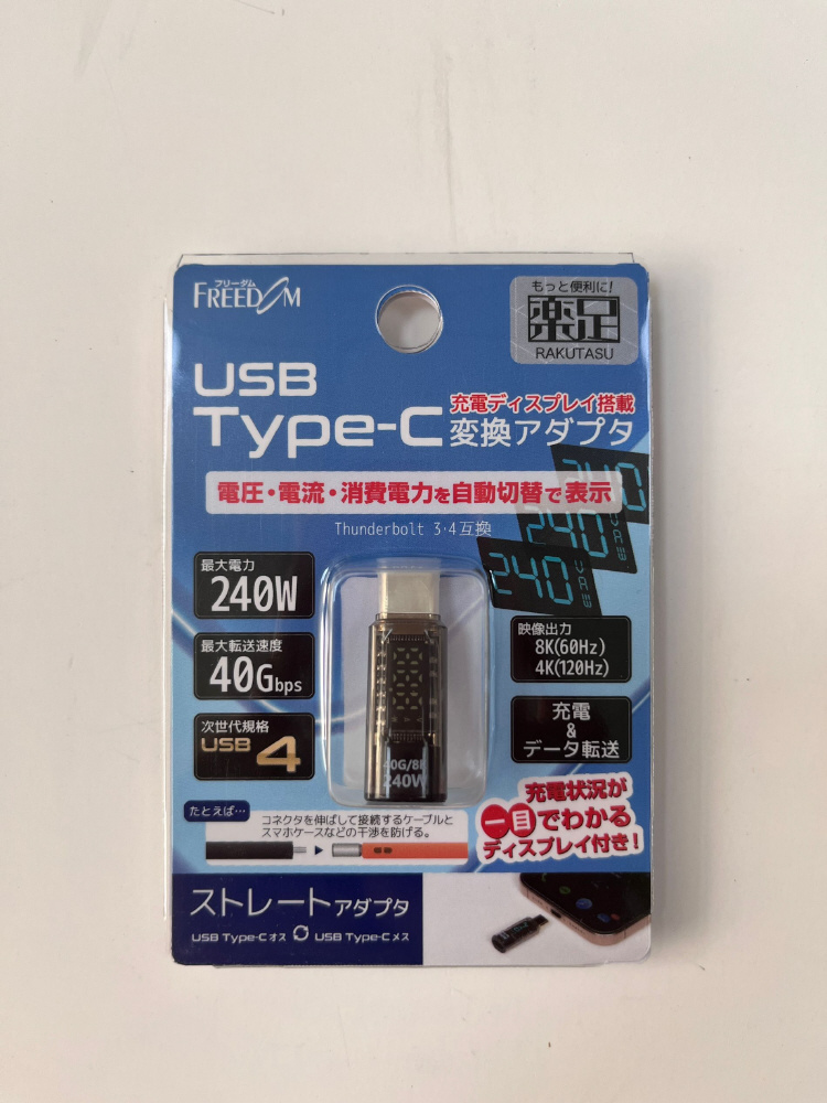 一目で分かる電力表示ディスプレイを搭載したUSB4対応Type-C変換アダプタ、電流[A]、電圧[V]、電力[W]を自動切り替えで順次に表示。高速充電(USB PD240W)、高速データ転送(最大40Gbps)、映像出力(8K/60Hz)に対応したストレート型アダプタ。