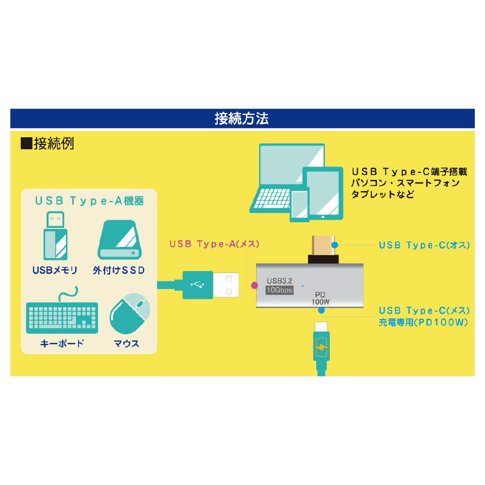 USB Type-CポートからUSB-Ax1、USB-C(PD100W)の機能を追加することが可能なL型変換アダプタです。高速データ転送(最大USB 10Gbps対応)しながら急速充電(最大USB PD100W対応)することが可能です。