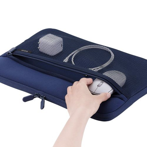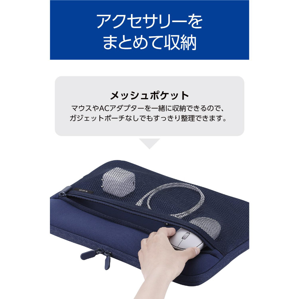 マウスやACアダプターを一緒に収納できるメッシュポケット付き。ガジェットポーチなしでもすっきり整理できます。