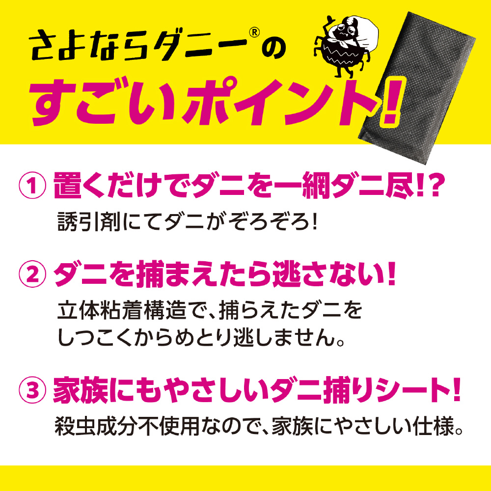 殺虫成分不使用の置くだけでダニを一網打尽!ダニを捕まえたら逃さない立体粘着構造でからめとり逃がさない!