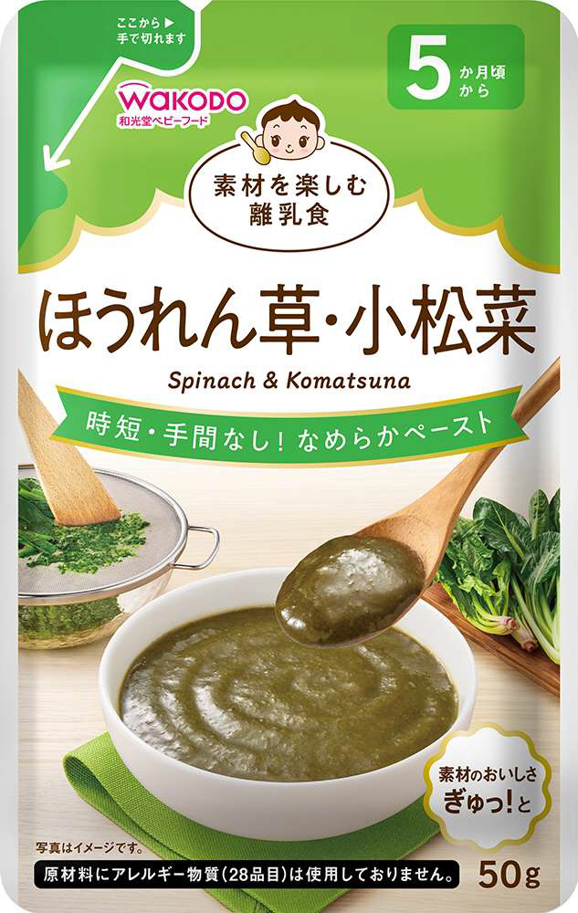 味付けはせず、素材を活かしたシンプルな原材料で、素材本来の味わいを楽しめるなめらかペーストのベビーフードです。調理が大変なほうれん草と小松菜をなめらかに裏ごししました。