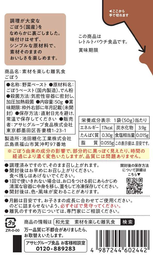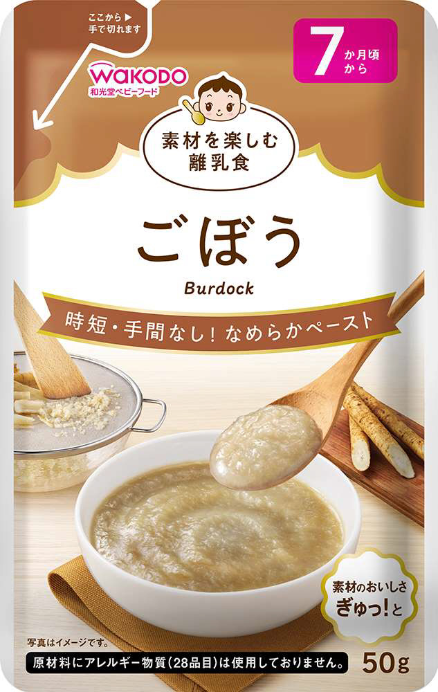 味付けはせず、素材を活かしたシンプルな原材料で、素材本来の味わいを楽しめるなめらかペーストのベビーフードです。調理が大変なごぼうをなめらかに裏ごししました。