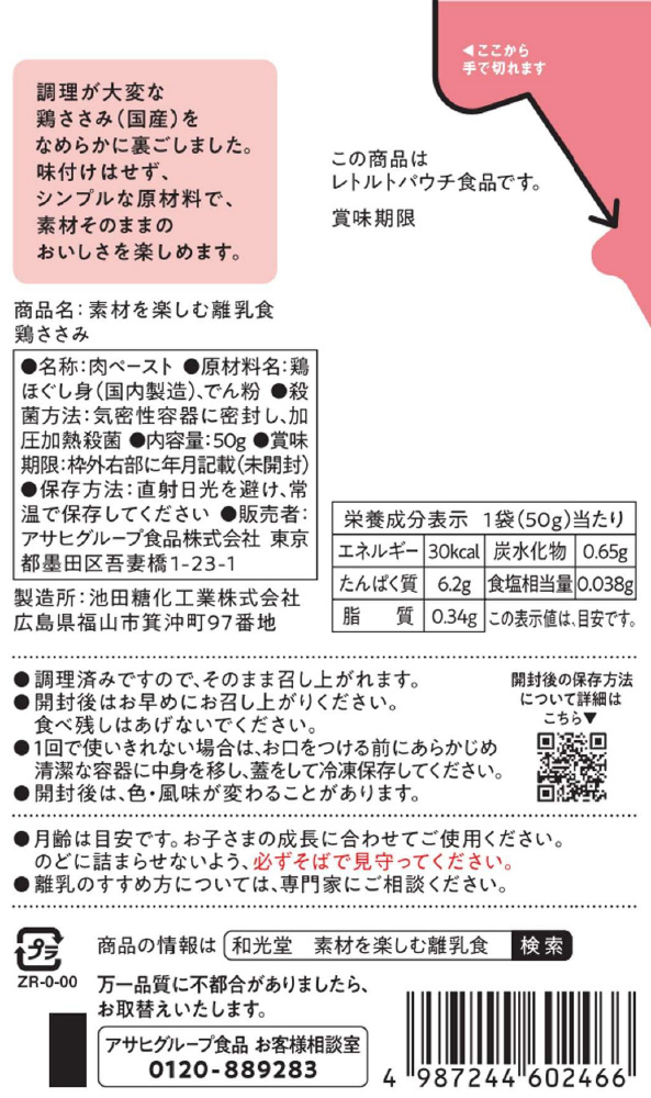 ・調理が大変な鶏ささみをなめらかに裏ごしました。味付けはせず、シンプルな原材料で、素材そのままのおいしさを楽しめます。器に注ぎやすい注出口付きパウチ。小分け冷凍の際にも便利。着色料、香料は使用しておりません。
