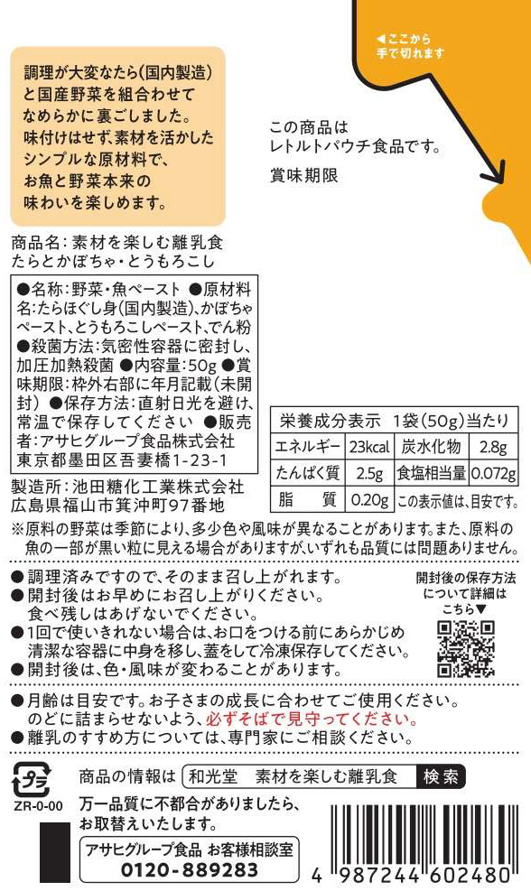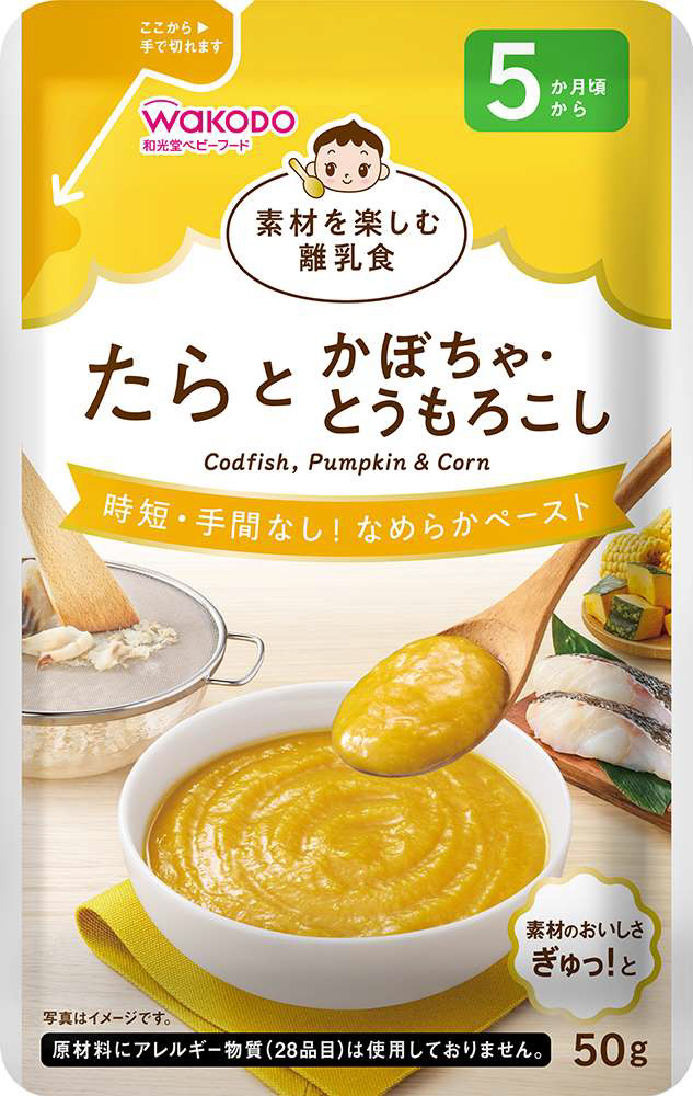 ・調理が大変なたらと野菜を組合わせてなめらかに裏ごしました。味付けはせず、素材を活かしたシンプルな原材料で、お魚と野菜本来の味わいを楽しめます。器に注ぎやすい注出口付きパウチ。小分け冷凍の際にも便利。・着色料、香料は使用しておりません。