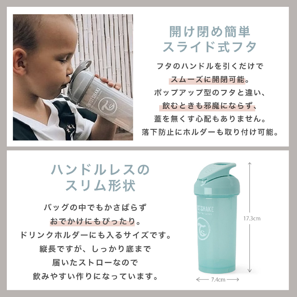 ハンドルのないスリムな形。バッグの中に入れてもすっきりかさばらないので、お出かけにぴったりです。縦長ですが、しっかり底まで届いたストローなので飲みやすい作りになっています。