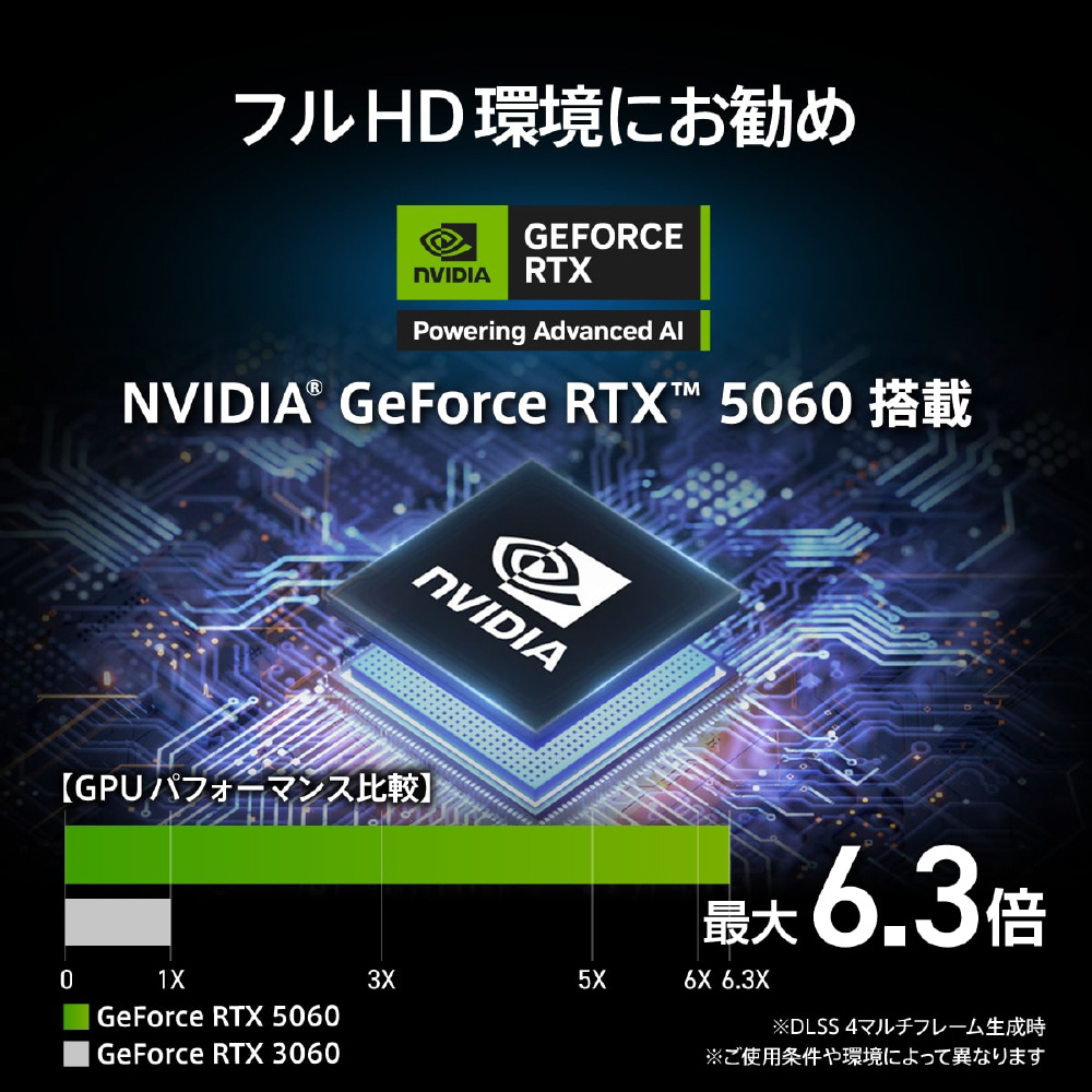 NVIDIA GeForce RTX 5060を搭載し、最新のDLSS 4対応ゲームで高いパフォーマンスを発揮します。