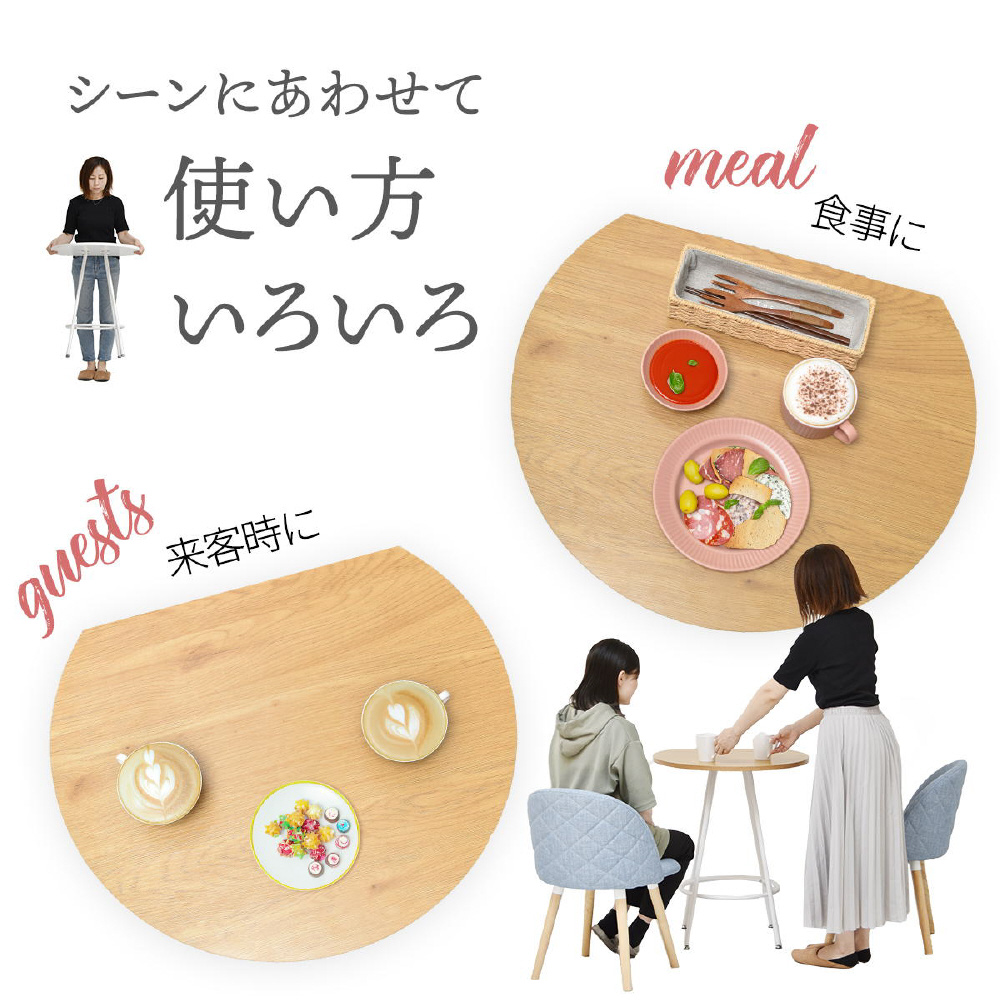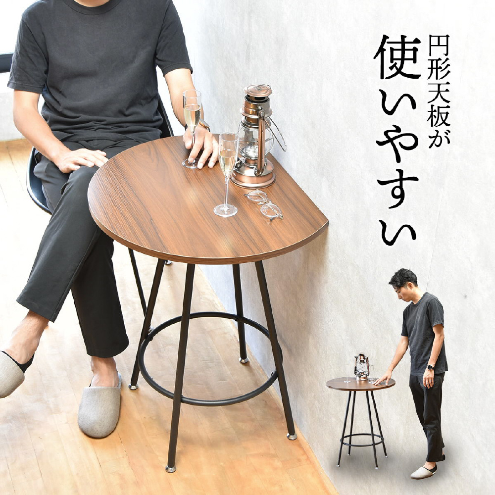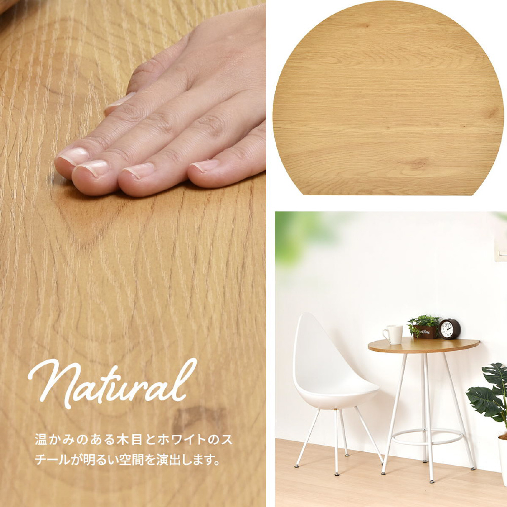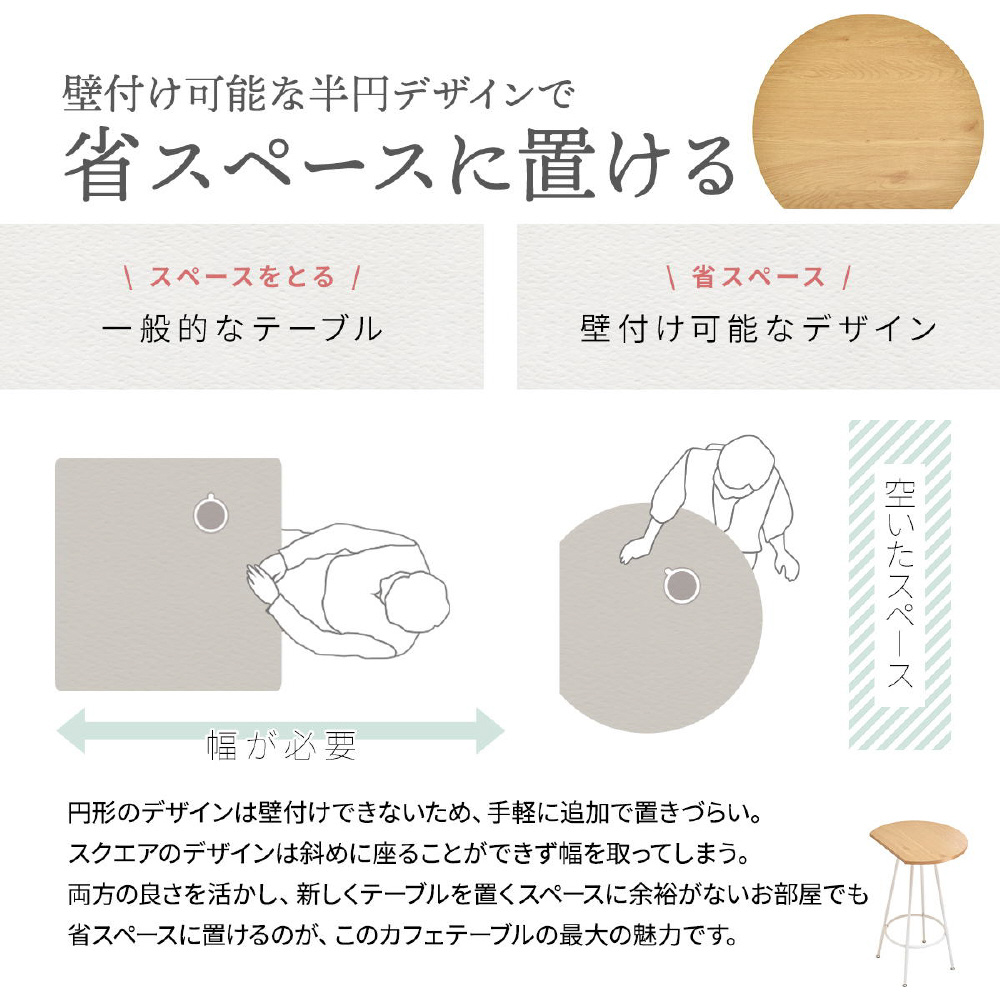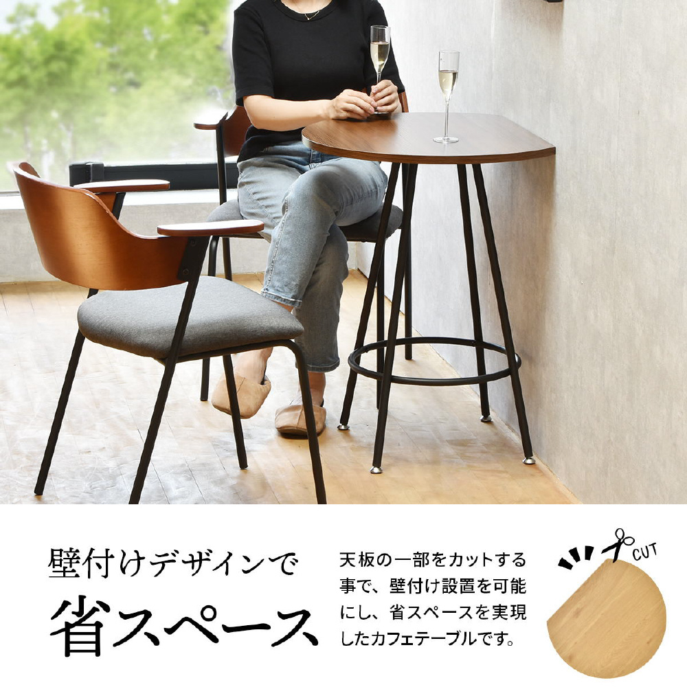 空間に柔らかみを与える円形天板の一部をカットする事で、壁付け設置を可能にし、省スペースを実現したカフェテーブルです。天板の中央部から放射上に伸びた4本の脚は安定性とスタイリッシュな印象をプラスします。天板は傷や水汚れに強いメラミン樹脂加工を施しておりますので、カフェテーブルとしての使用以外にも一人用のダイニングテーブルやパソコン作業スペースとしても安心してご使用頂けます。