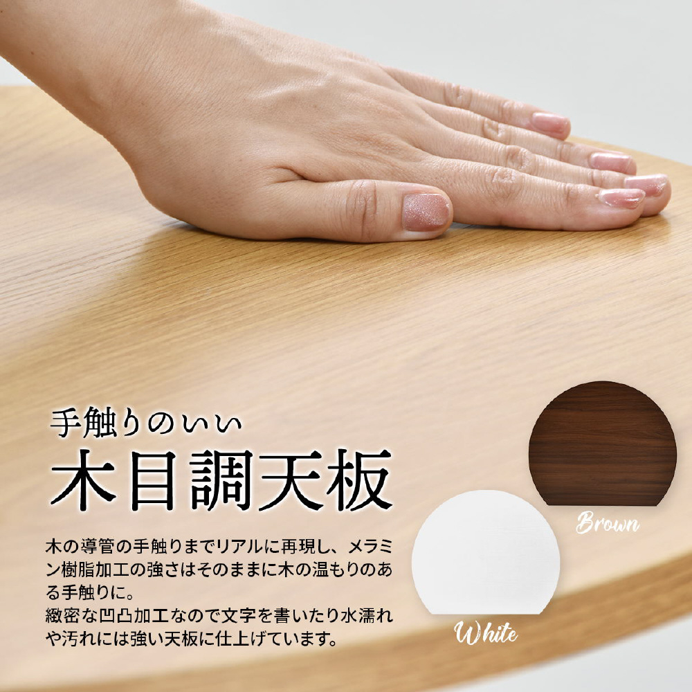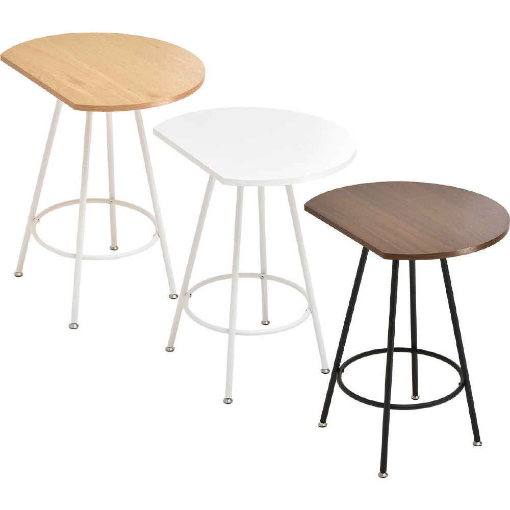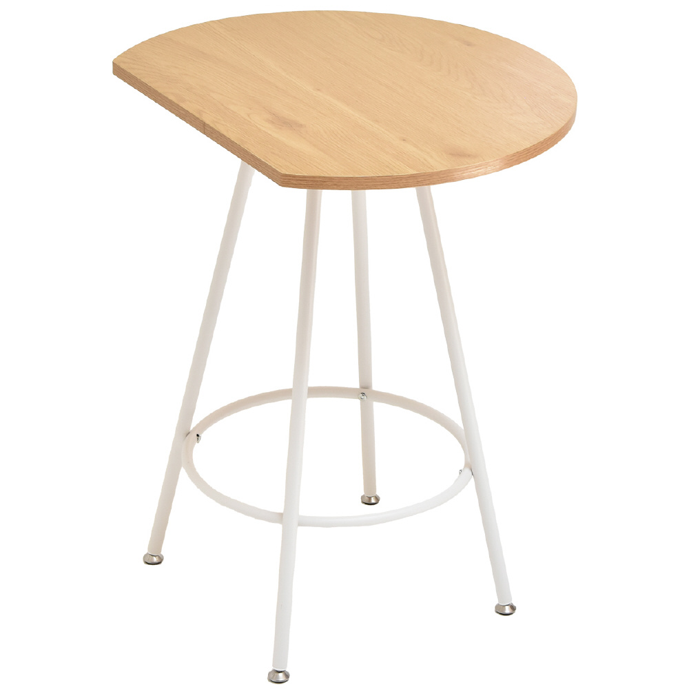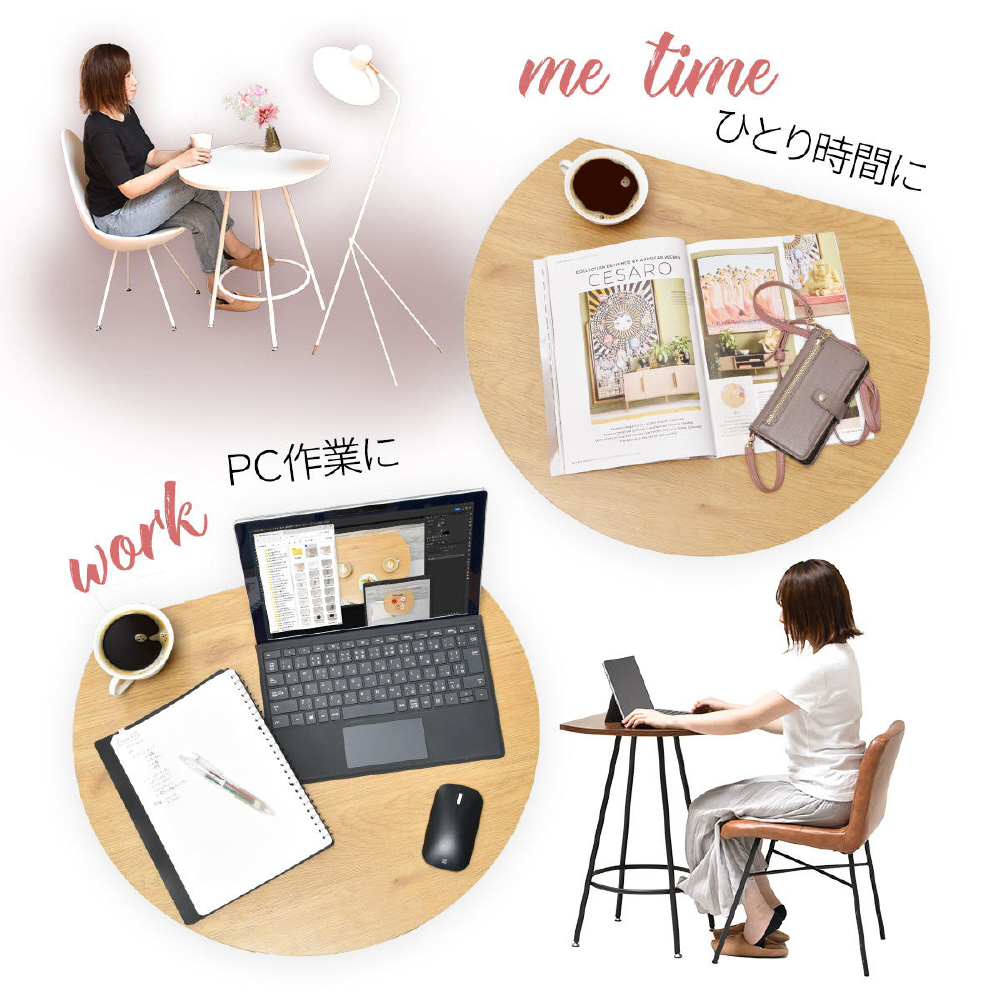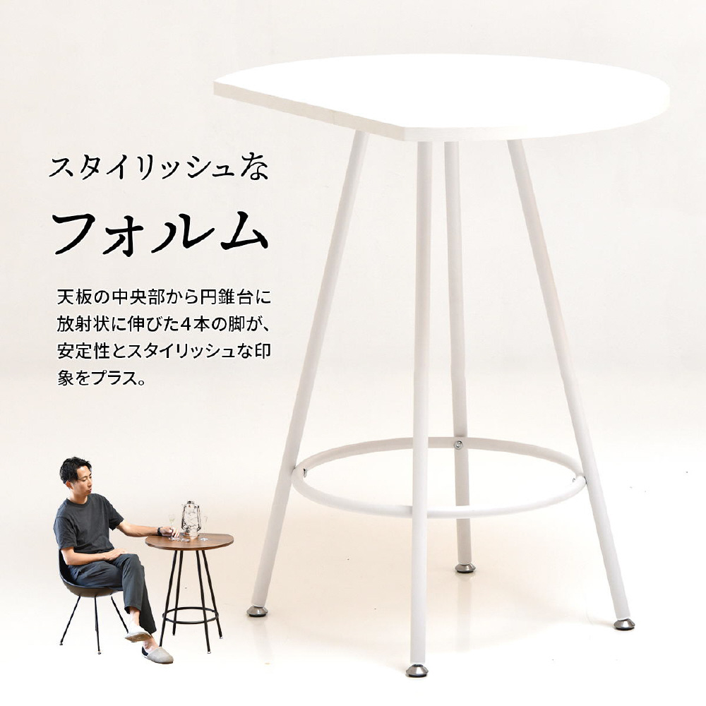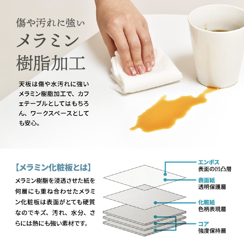 空間に柔らかみを与える円形天板の一部をカットする事で、壁付け設置を可能にし、省スペースを実現したカフェテーブルです。天板の中央部から放射上に伸びた4本の脚は安定性とスタイリッシュな印象をプラスします。天板は傷や水汚れに強いメラミン樹脂加工を施しておりますので、カフェテーブルとしての使用以外にも一人用のダイニングテーブルやパソコン作業スペースとしても安心してご使用頂けます。