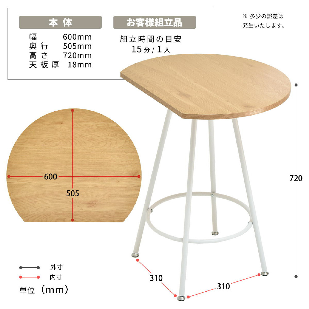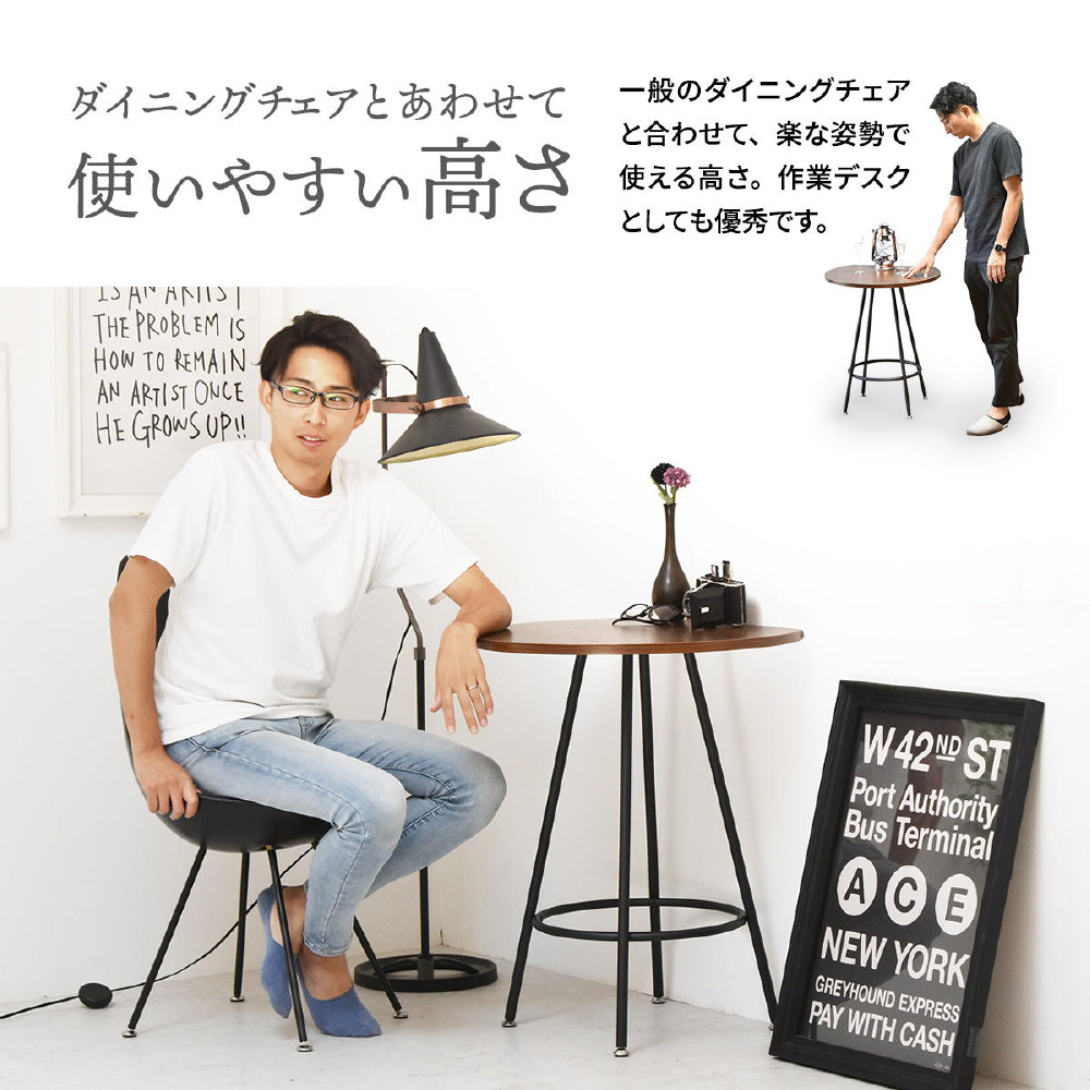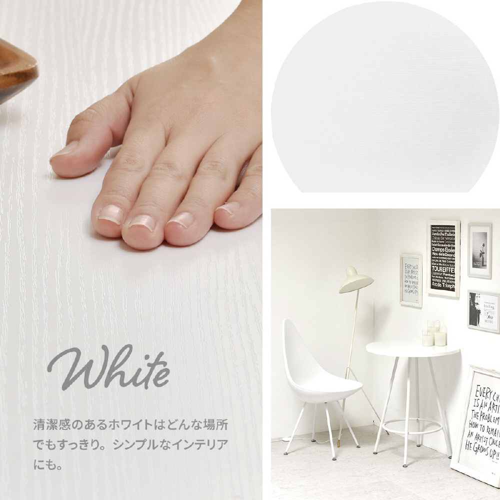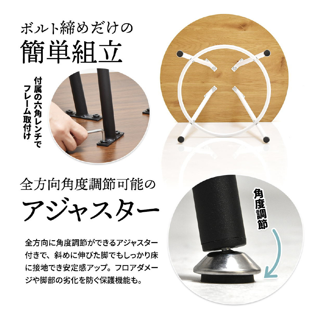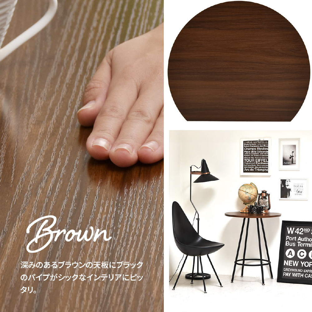 空間に柔らかみを与える円形天板の一部をカットする事で、壁付け設置を可能にし、省スペースを実現したカフェテーブルです。天板の中央部から放射上に伸びた4本の脚は安定性とスタイリッシュな印象をプラスします。天板は傷や水汚れに強いメラミン樹脂加工を施しておりますので、カフェテーブルとしての使用以外にも一人用のダイニングテーブルやパソコン作業スペースとしても安心してご使用頂けます。