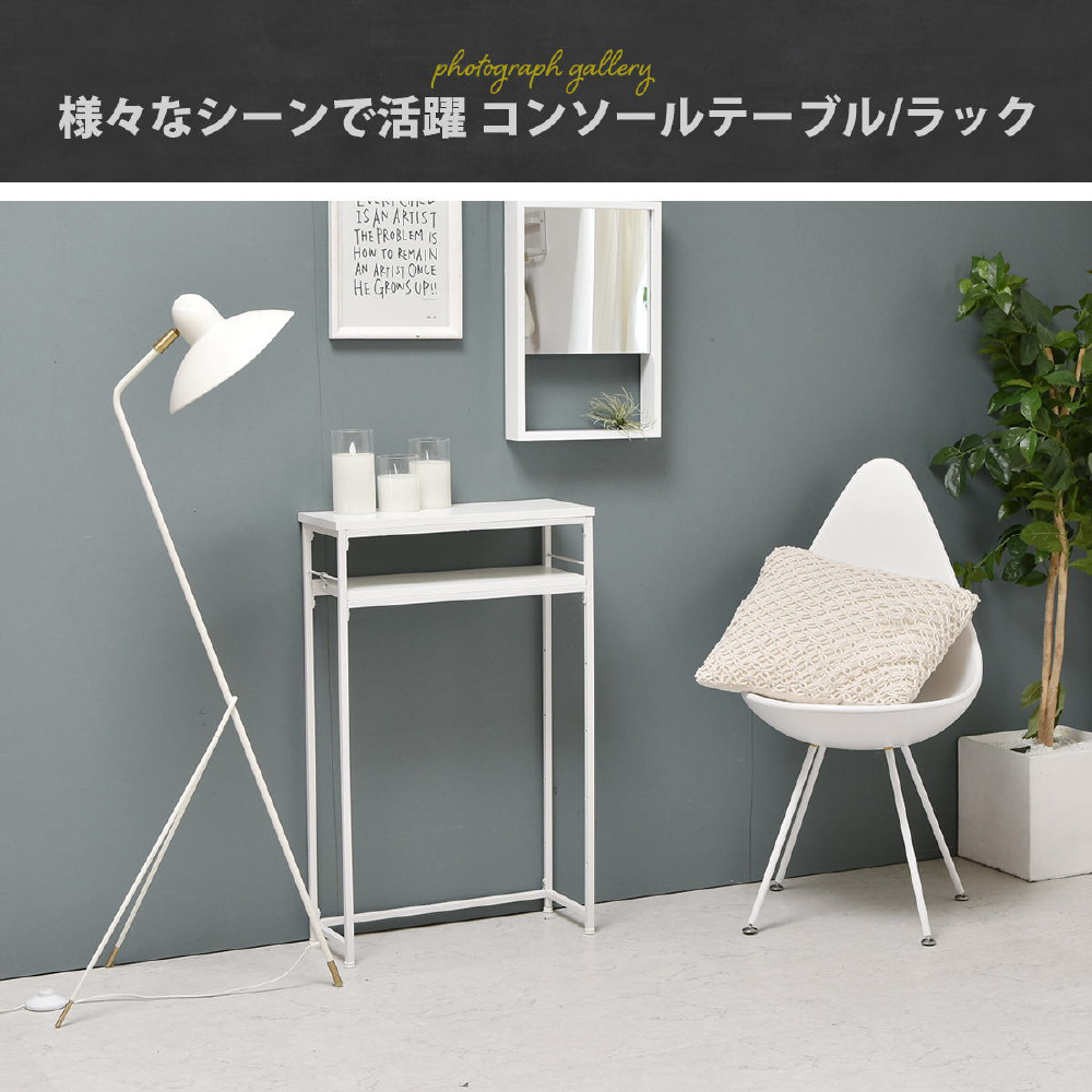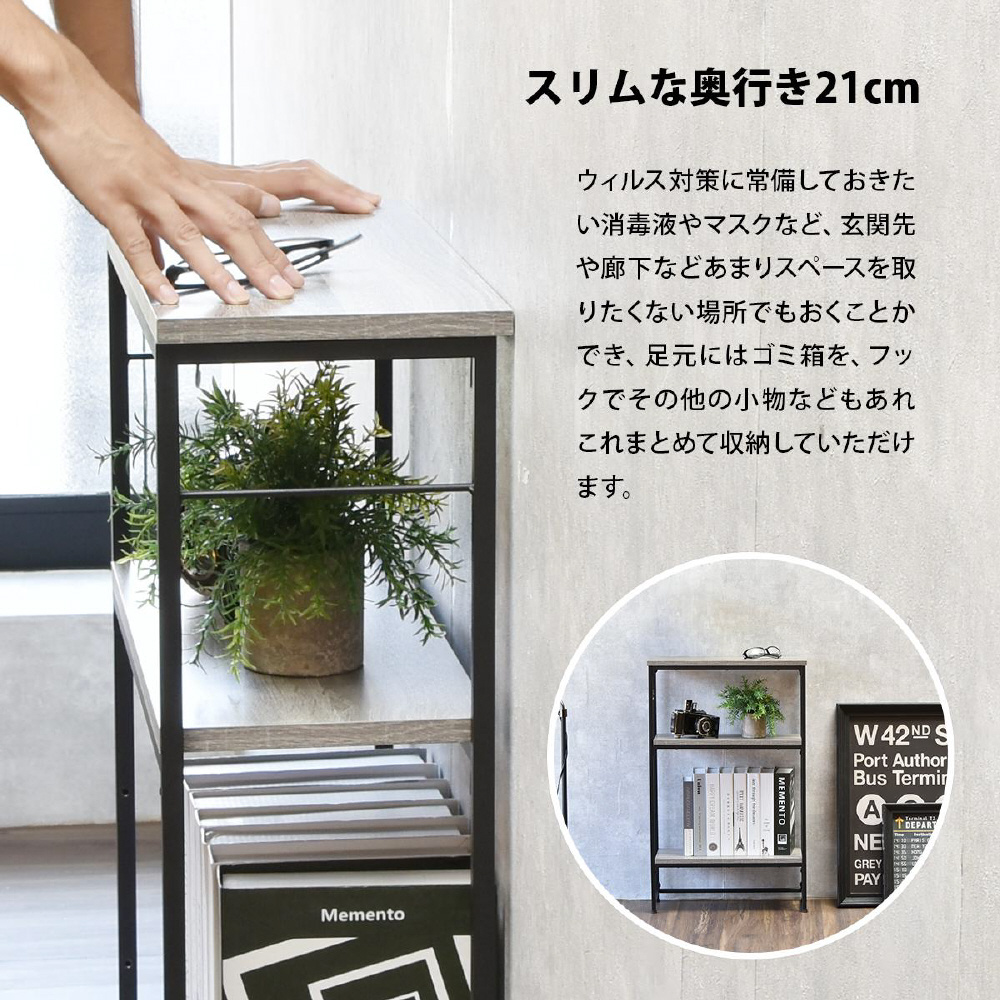 玄関や廊下など広さが限られたスペースも設置可能なスリムなラックタイプのコンソールテーブルです。棚板の取り付け位置は5か所の中からお好みに合わせて選択頂けます。シャープで圧迫感の無い落ち着いたデザインとしておりますのでリビング、キッチンカウンター下の収納、サニタリー収納等、設置場所を選ばないマルチなラックとしてご使用可能です。フレームの両サイドにはフックを引っ掛けることも可能。