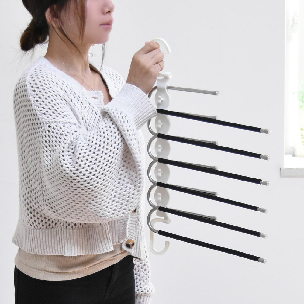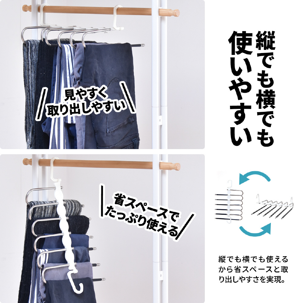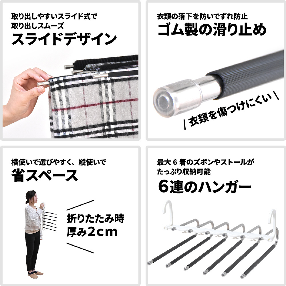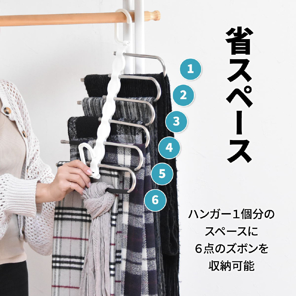省スペースで6本のズボンが収納できる画期的な、ズボンハンガーです。折りたたんで使用すれば、6本のズボンが1本のハンガーにつるせる省スペースで利用できて、開いて使用すれば1本1本のバーにズボンがつられているので見やすいです。バーをスライドさせながら出し入れができるので、簡単で使いやすさ満点。マフラーやストールなども掛けることができます。