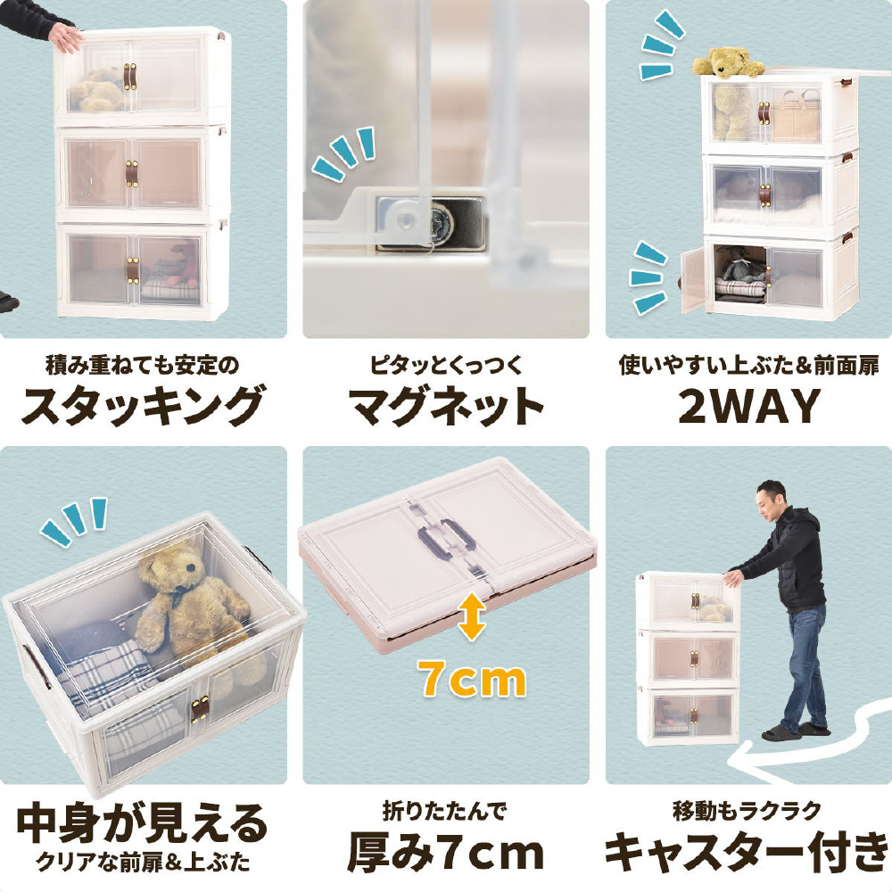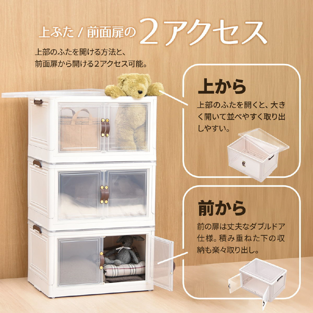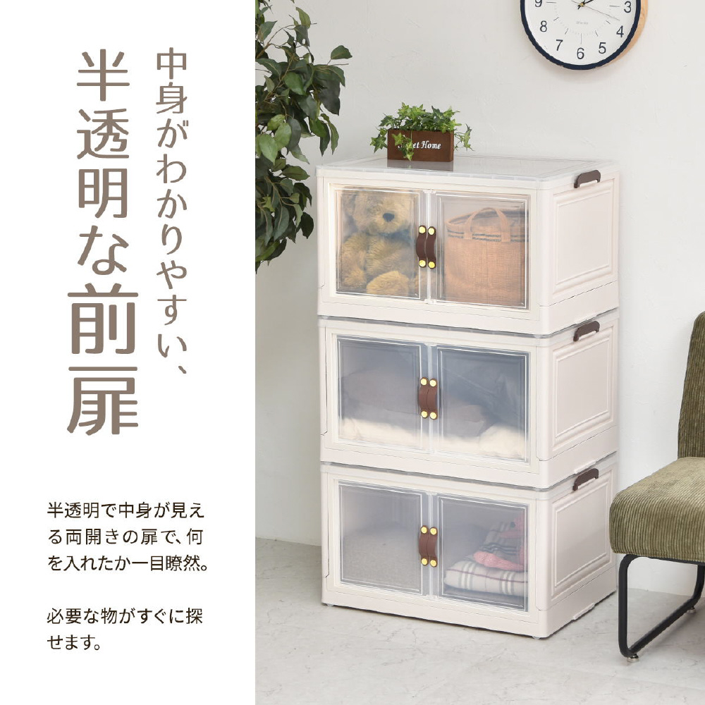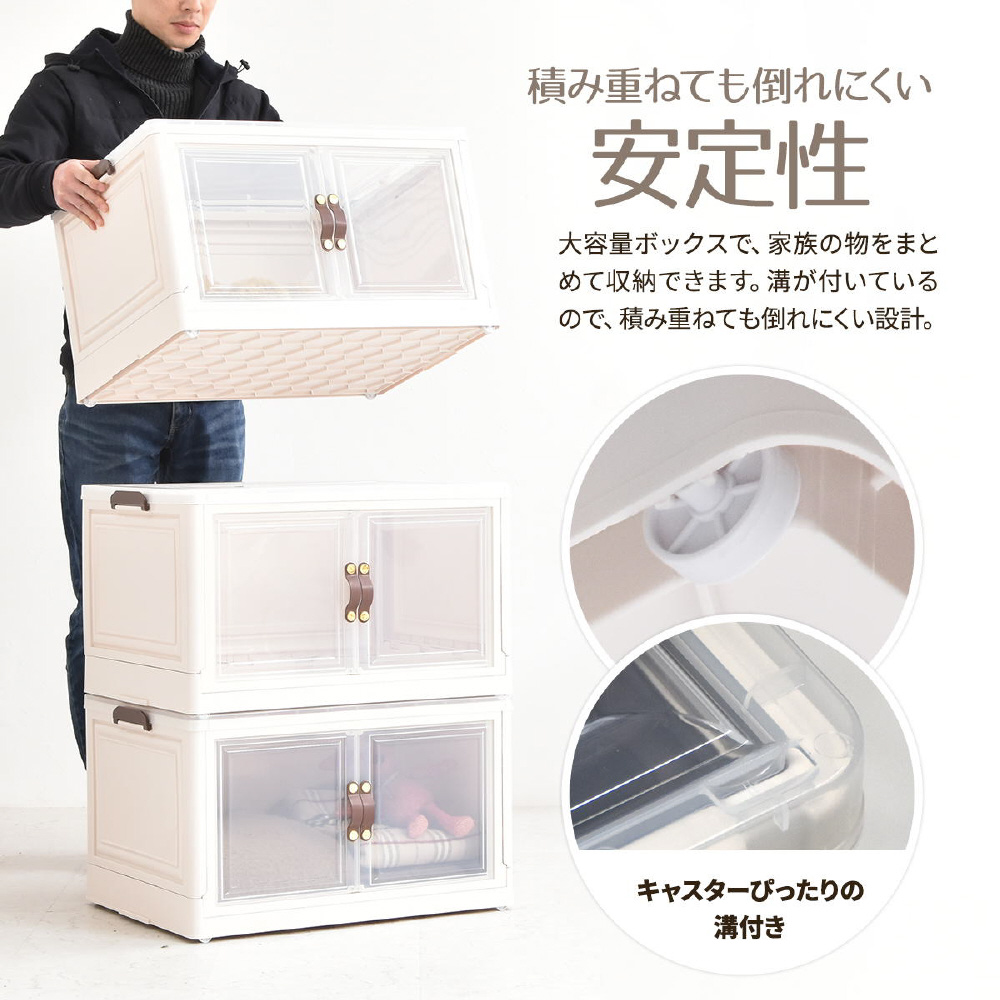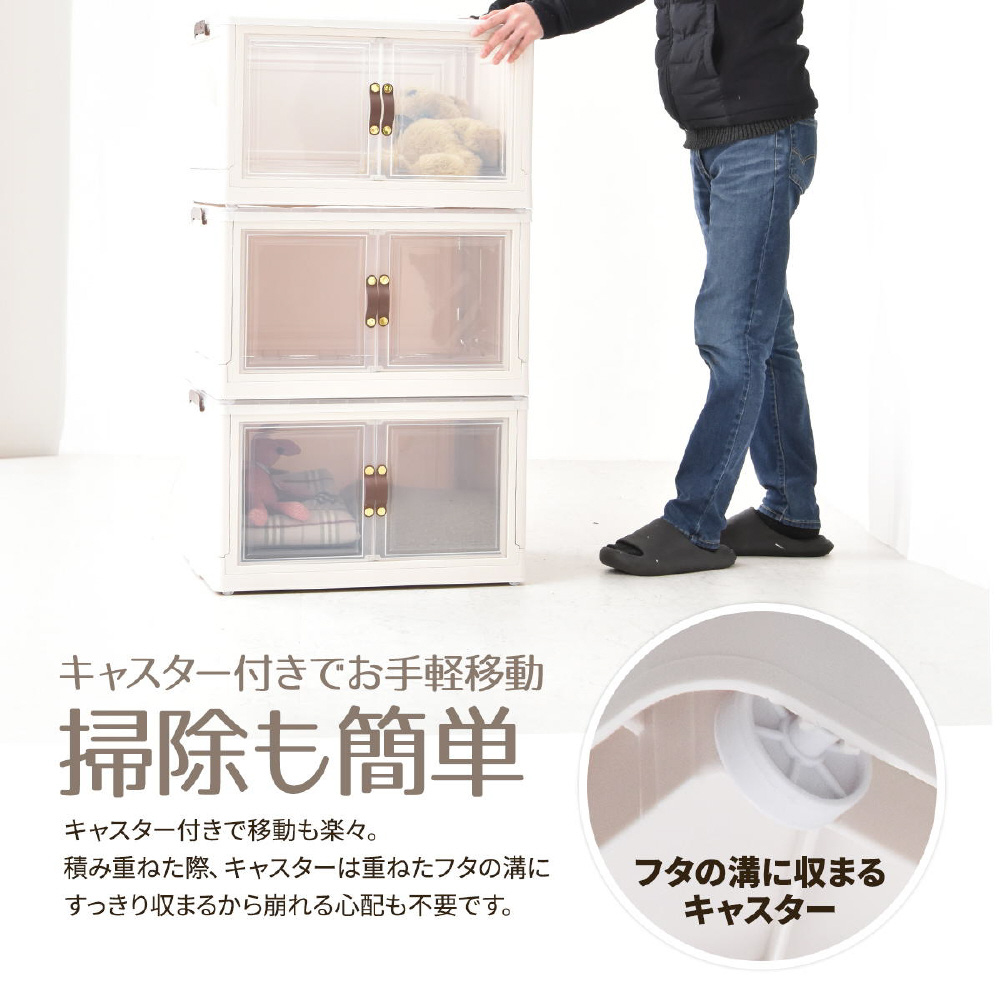 半透明で中身が見える可愛い収納ボックス。底部分にはキャスターがついており、移動が楽なのでお掃除する時にも便利です。また積み重ねができる仕様になっているので、お部屋のスペースやご利用になりたい容量などに合わせて積み重ねてお使いいただける点や、天板と前扉が半透明なので中身がすぐわかるという点もおすすめです。