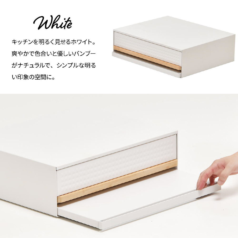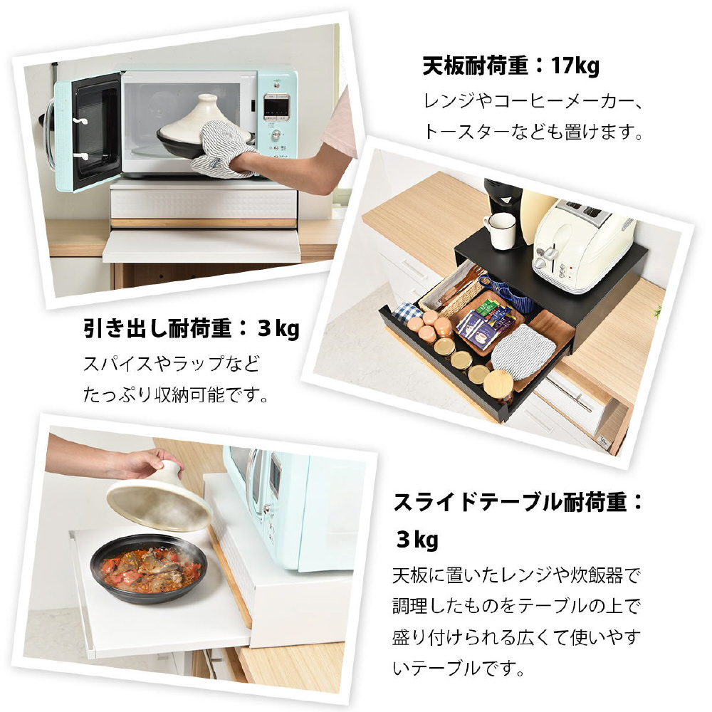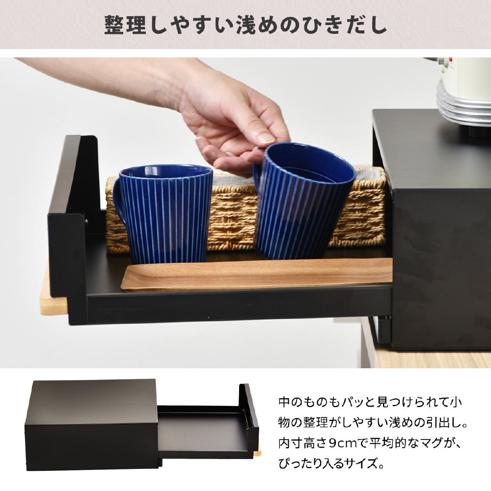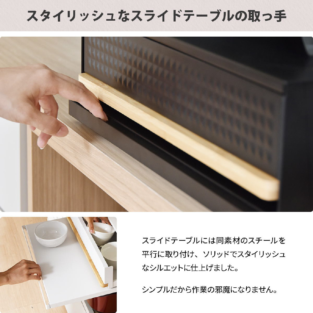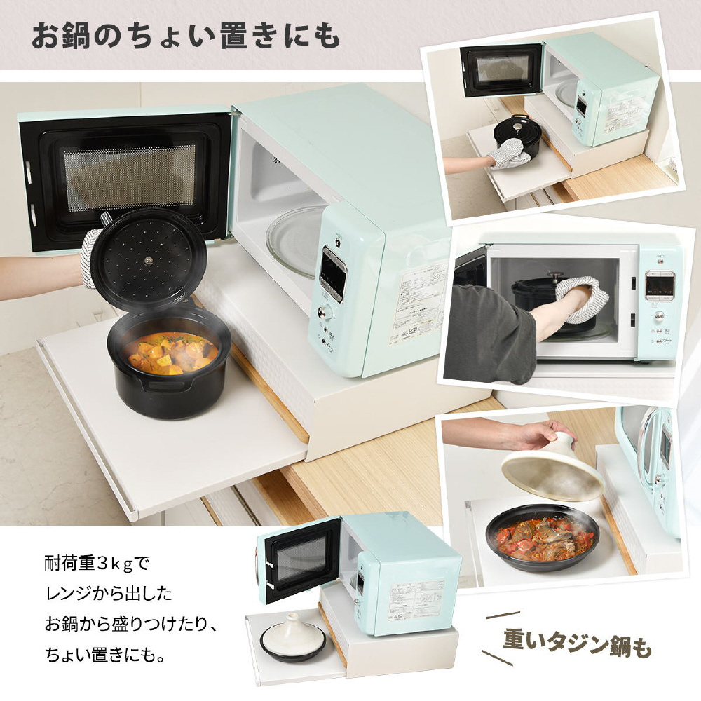 電子レンジやトースターの下に置くだけで便利な作業スペースができる、家電下引き出し収納スライドテーブル。レンジや家電周りにひろびろ作業スペースを作って家事効率をアップ。電子レンジや炊飯器の下に設置すれば必要な時に便利な作業スペースがつくれます。下段はレンジ調理の時やご飯をよそう時にあると便利な作業台で、上段は小物を収納できる便利な引き出し付き。