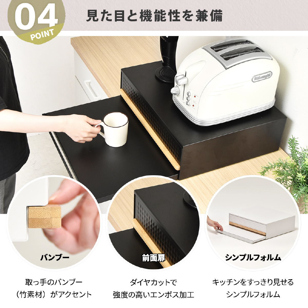 電子レンジやトースターの下に置くだけで便利な作業スペースができる、家電下引き出し収納スライドテーブル。レンジや家電周りにひろびろ作業スペースを作って家事効率をアップ。電子レンジや炊飯器の下に設置すれば必要な時に便利な作業スペースがつくれます。下段はレンジ調理の時やご飯をよそう時にあると便利な作業台で、上段は小物を収納できる便利な引き出し付き。