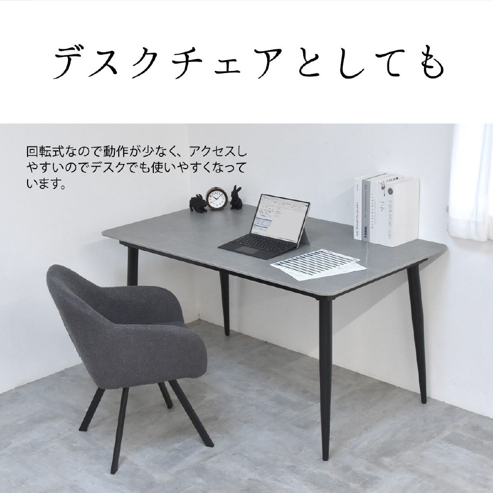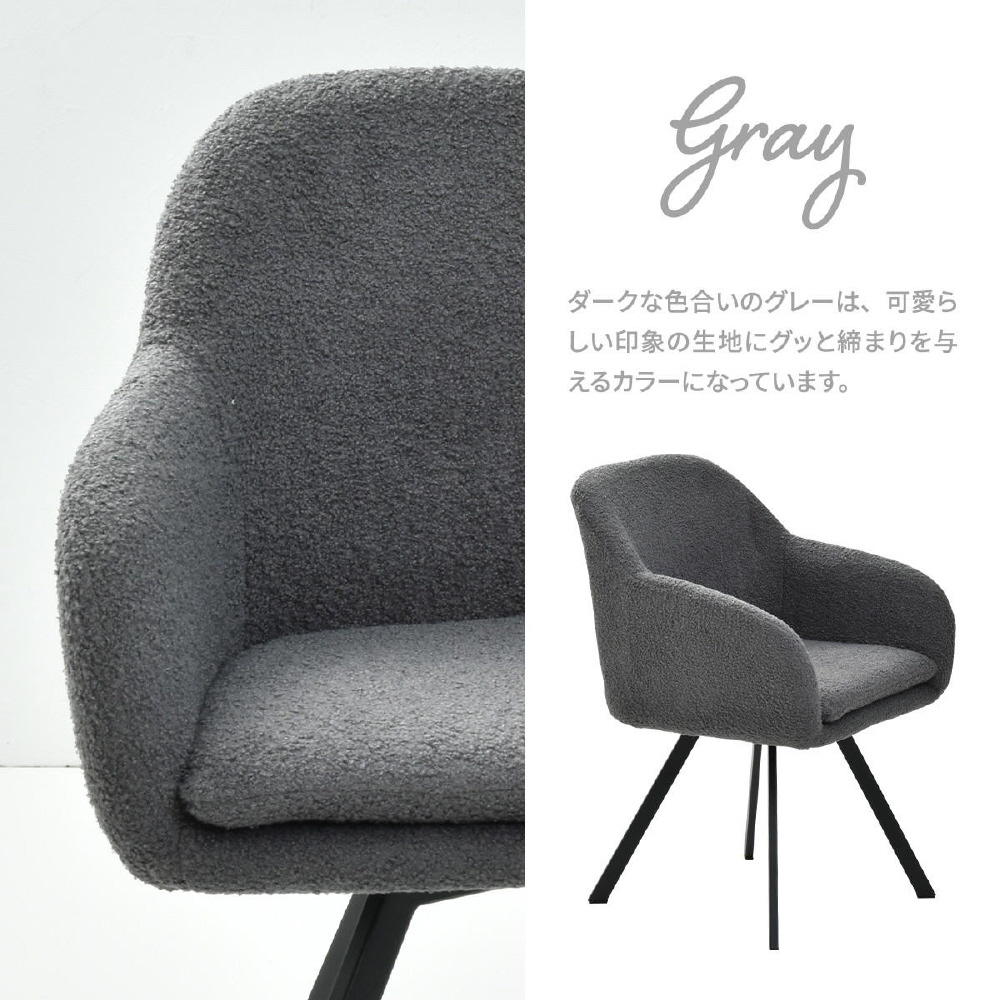 モダンなデザインのブークレ素材の回転機能付きダイニングチェア。優れた快適さと耐久性を備えています。長時間の食事や会話を楽しむのに最適です。ファブリックは触り心地がやわらかなブークレ素材。洗練されたデザインは、どんなインテリアにも調和し、快適な座り心地を提供します。上品さを醸し出しながらも甘すぎないベーシックなデザインは、モダンで落ち着いた大人の空間を演出します。
