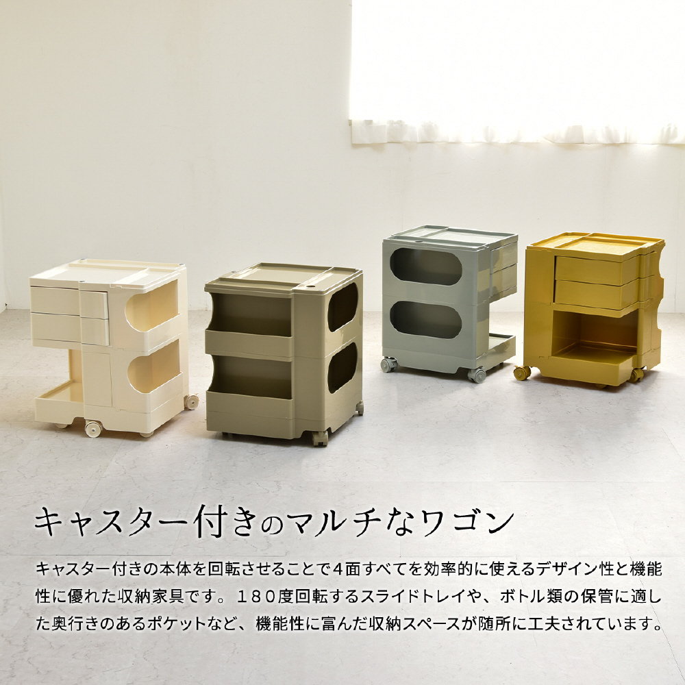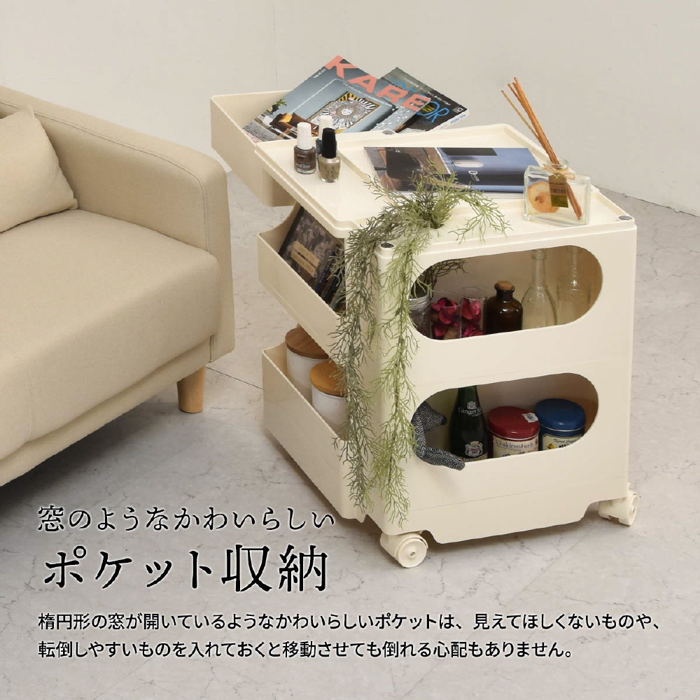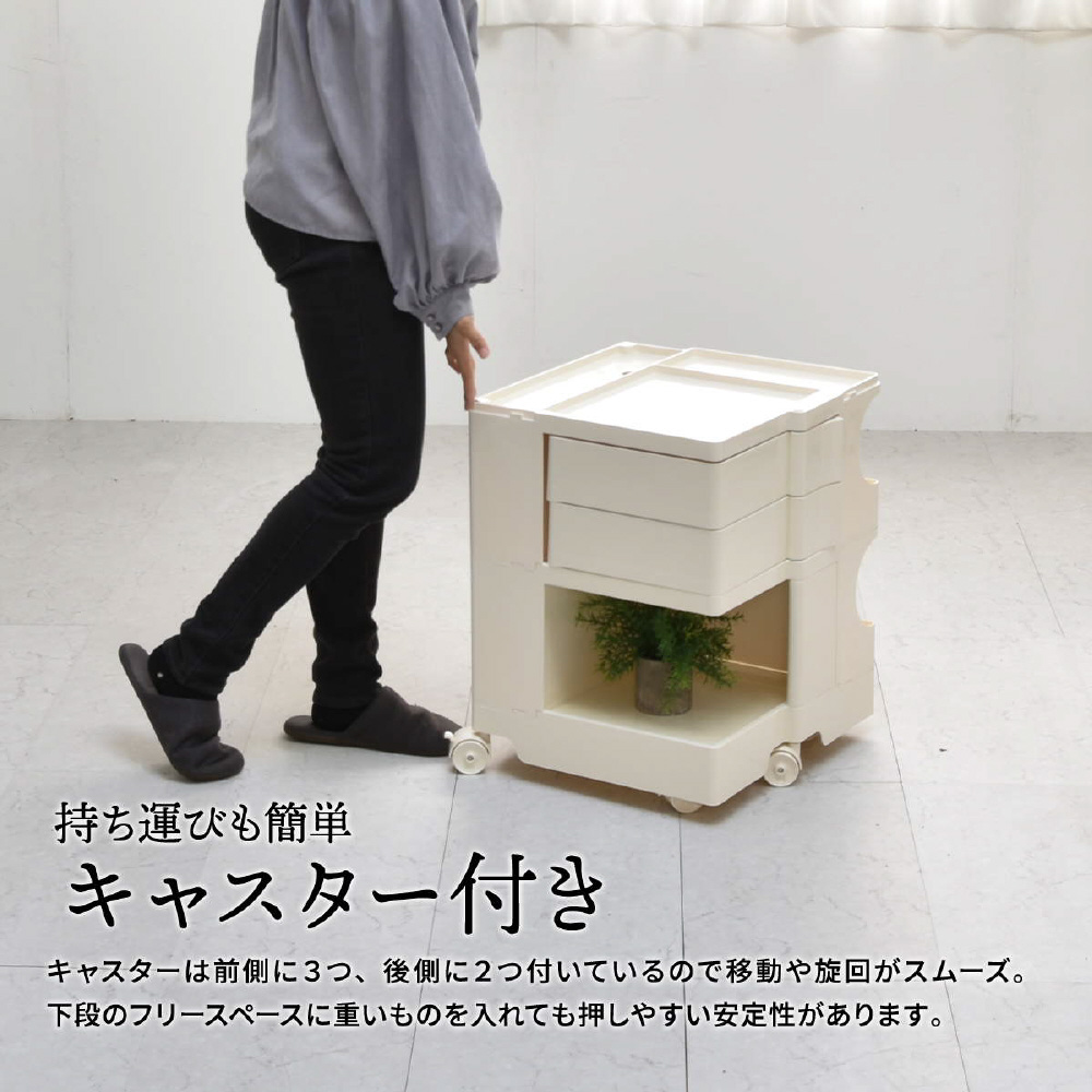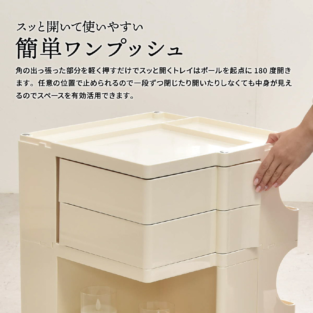 キャスター付きの本体を回転させることで側面4面すべてを効率的に使える、デザイン性と機能性に優れた収納家具です。180度回転するスライドトレイや、ボトル類の保管に適した奥行きのあるポケットなど、機能性に富んだ収納スペースが随所に工夫されています。ABS樹脂製なので衝撃にも強く、汚れたときの拭き取りも簡単にお手入れができます。