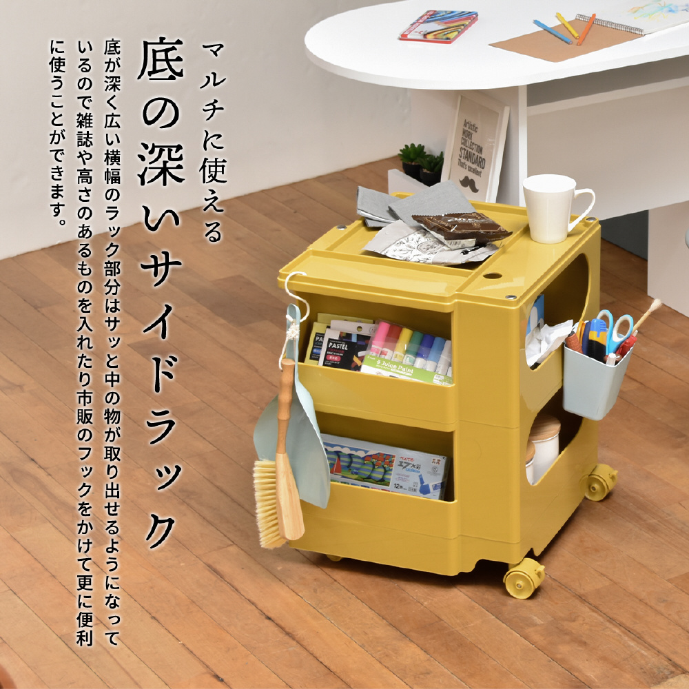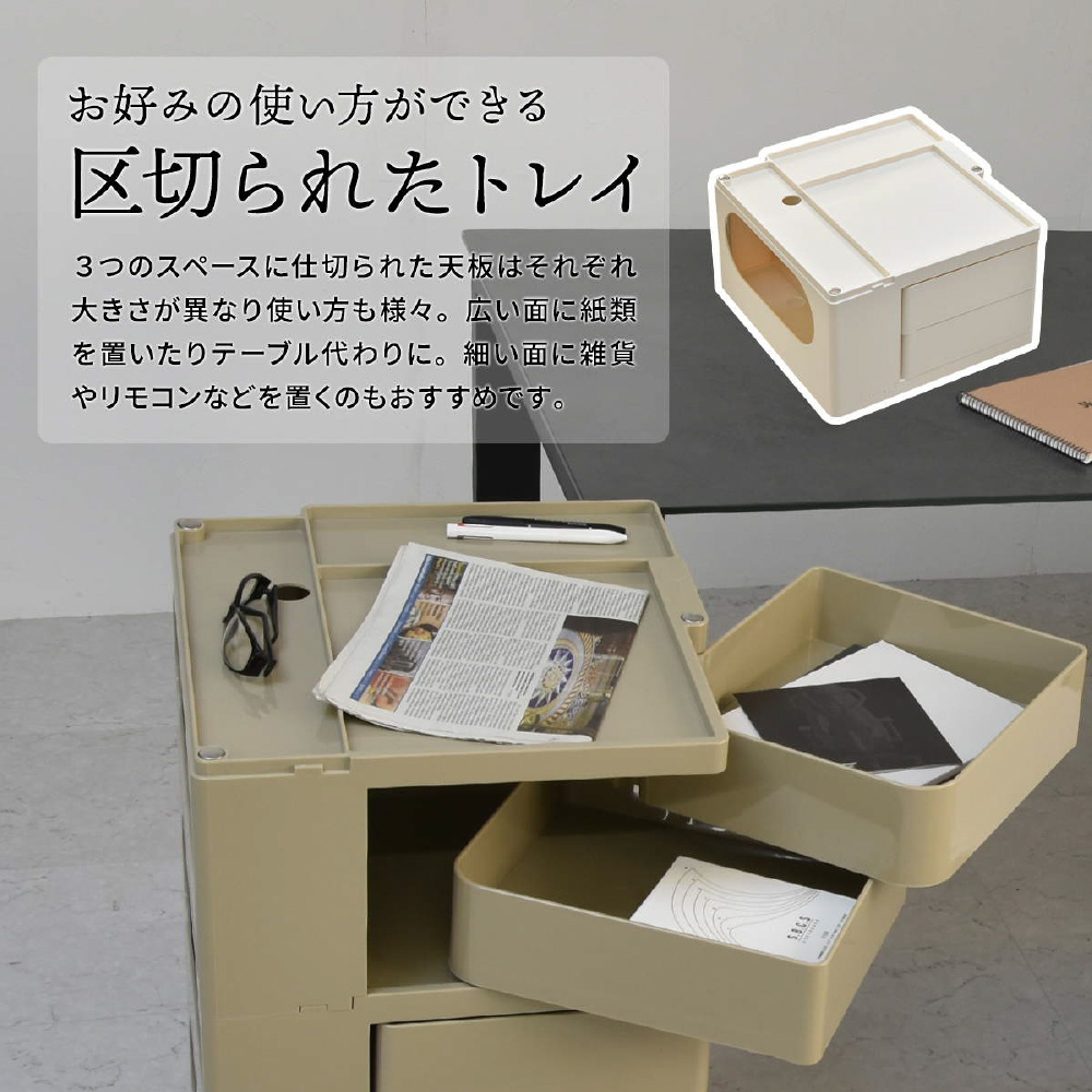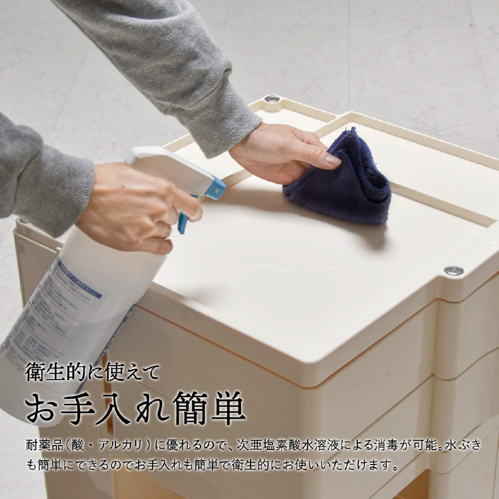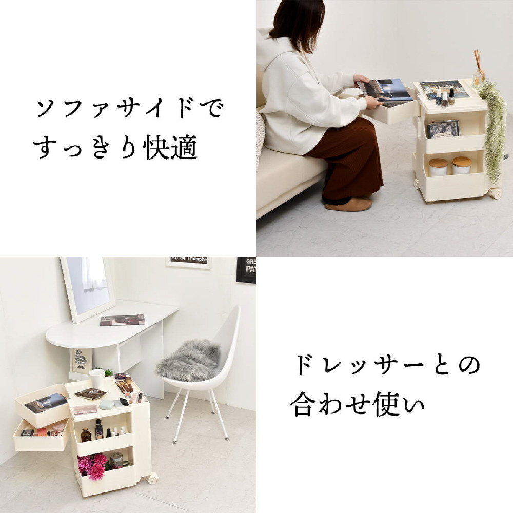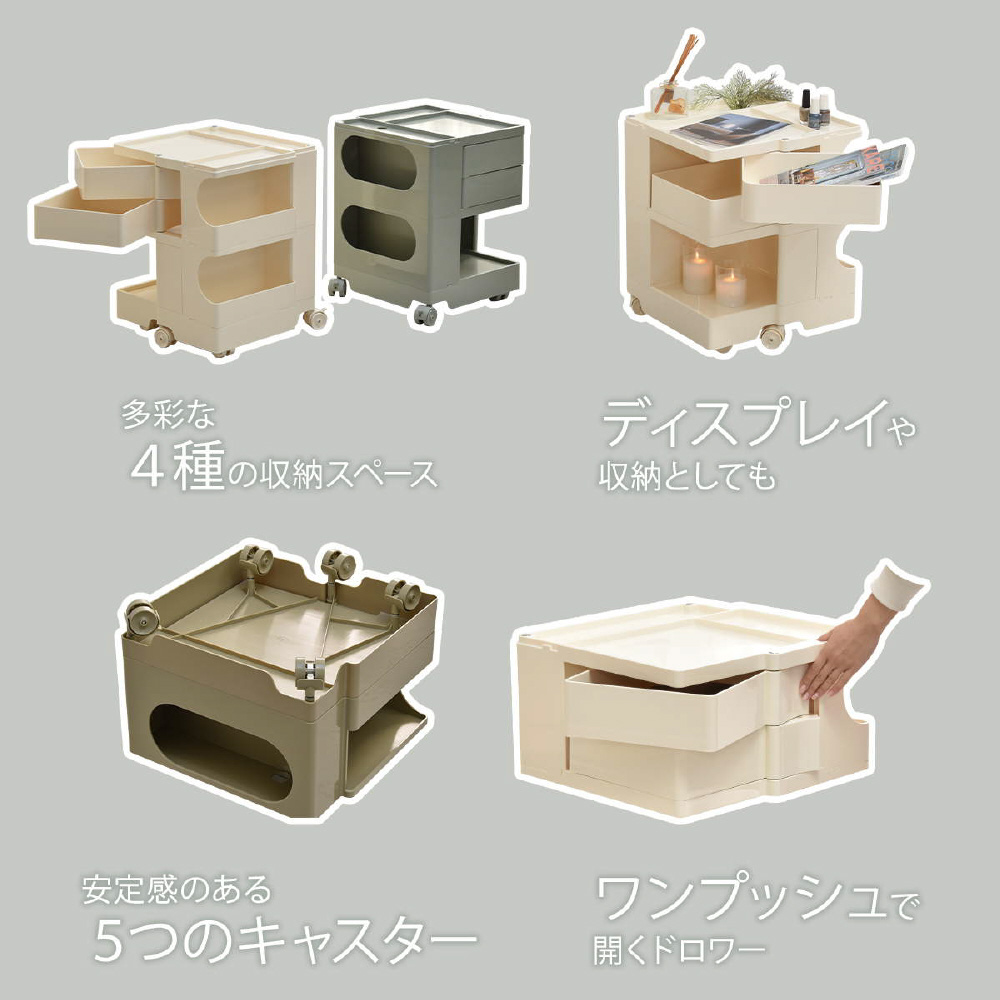 キャスター付きの本体を回転させることで側面4面すべてを効率的に使える、デザイン性と機能性に優れた収納家具です。180度回転するスライドトレイや、ボトル類の保管に適した奥行きのあるポケットなど、機能性に富んだ収納スペースが随所に工夫されています。ABS樹脂製なので衝撃にも強く、汚れたときの拭き取りも簡単にお手入れができます。