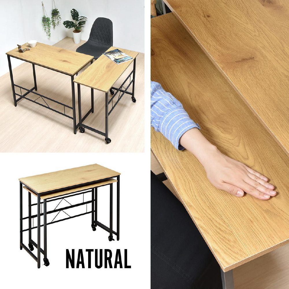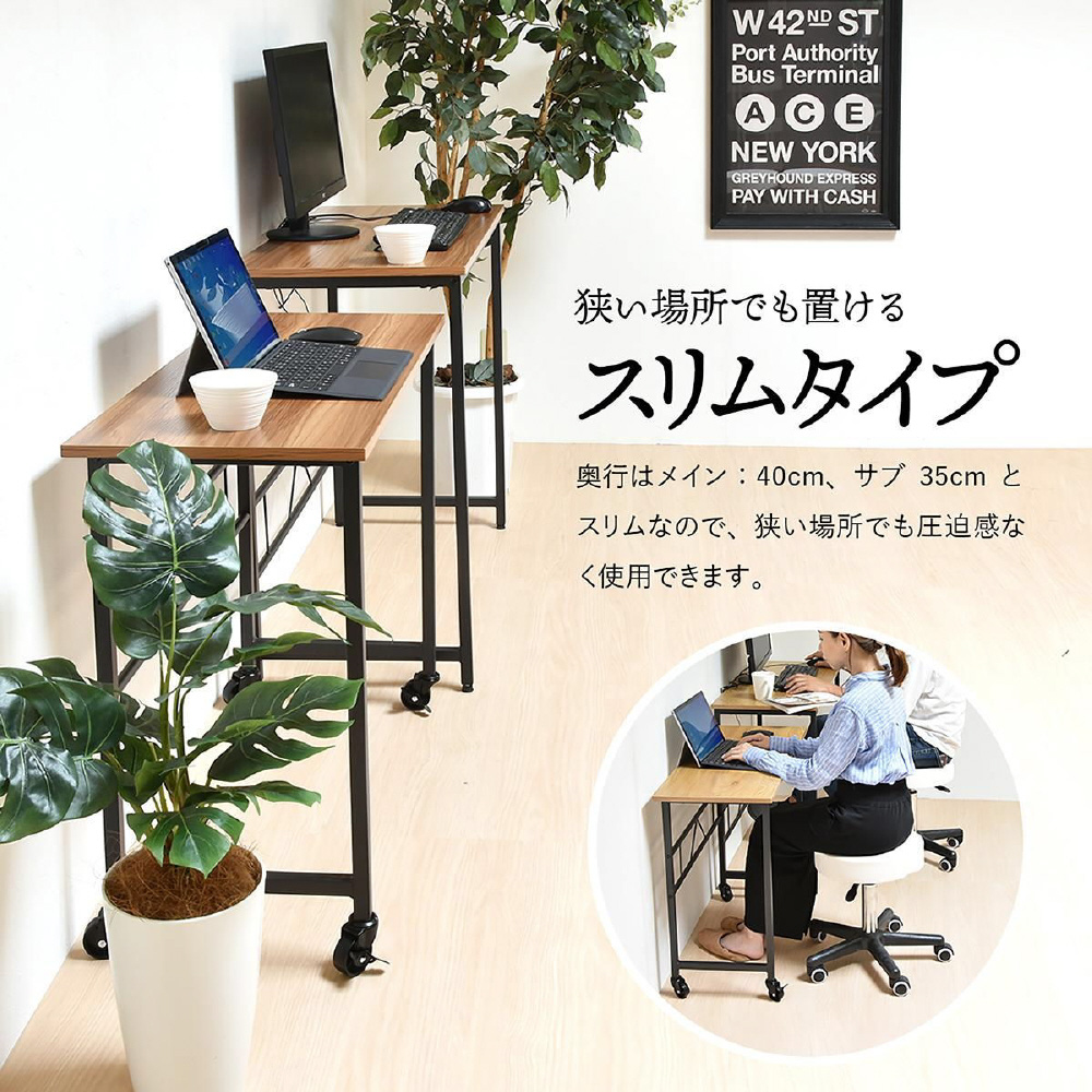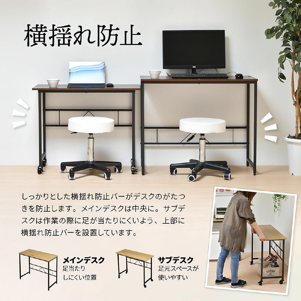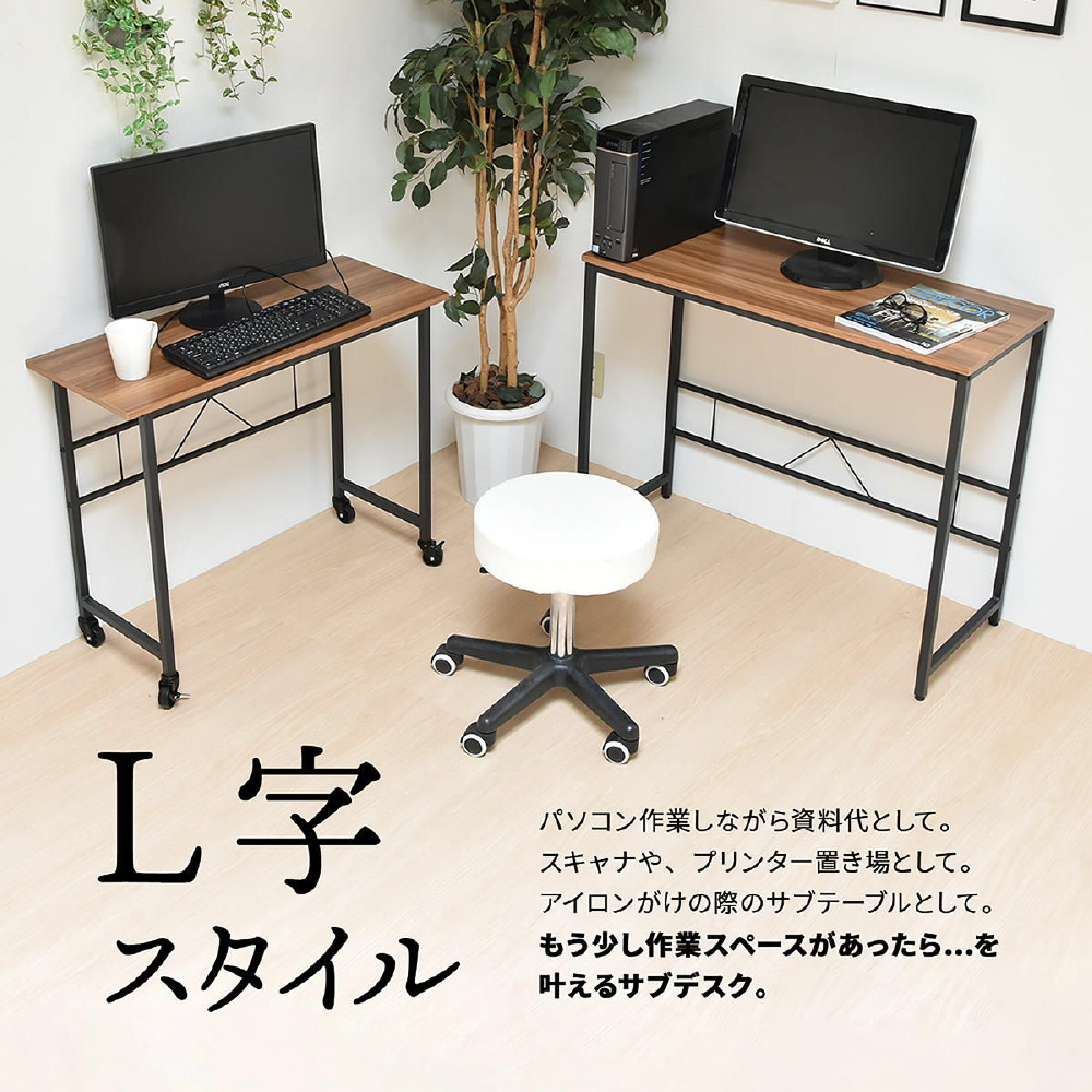 メインデスクとサブデスクがそれぞれ独立し、重ねたり並べたりL字に置いたりと自由に配置できるデスクです。 サブデスクにはキャスターがついているのでワゴンの代わりとしても使用できます。