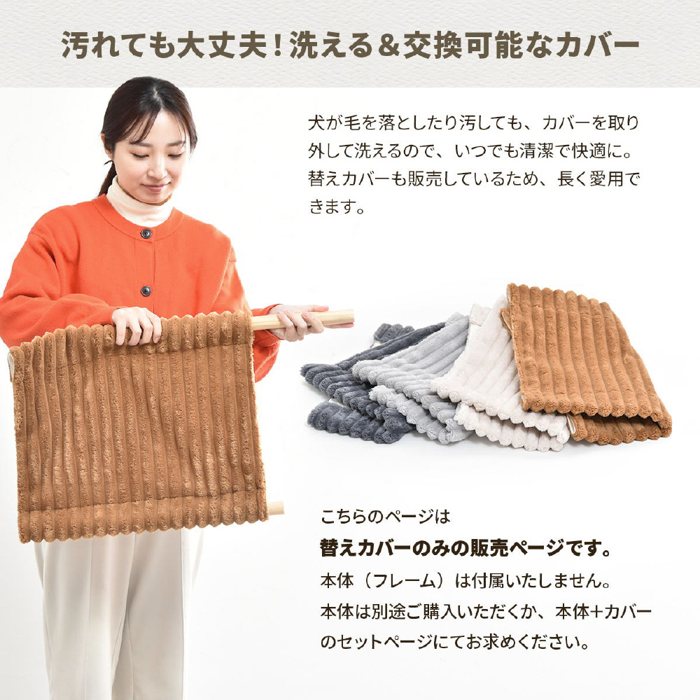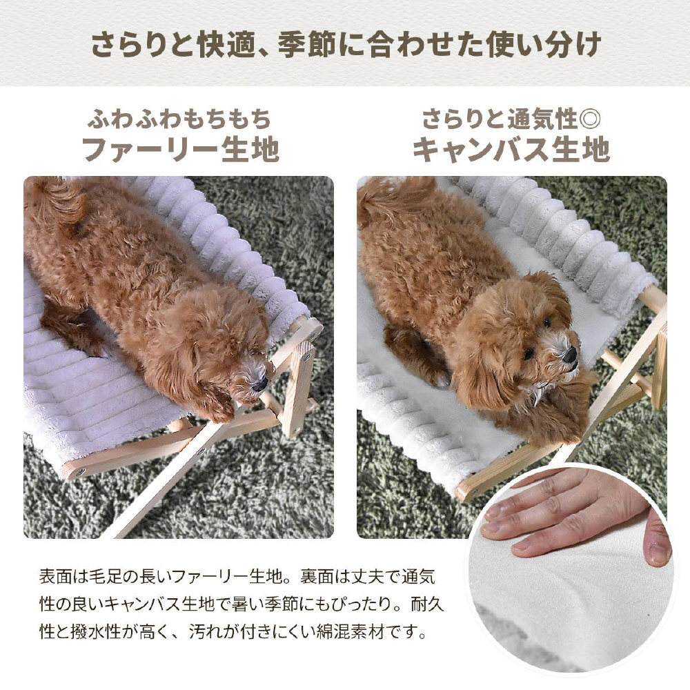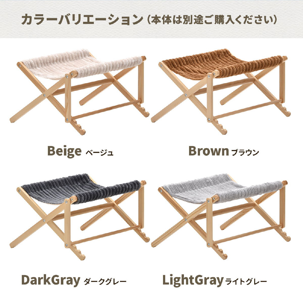 折りたたみペットハンモック Mofcotは、折りたたんで持ち運びのできるペット用の簡易ベッドです。フレームにはパインの天然木を使用し、カバー部分の表面には毛足の長い肌触りの良い生地、裏面にはさらりとした肌触りのしっかりめの生地を使用しております。カバーは汚れても洗濯可能ですし、万が一ベースが破損したり、カバーが破れてしまっても、それぞれ単品での販売もしておりますので長く使っていただけます。