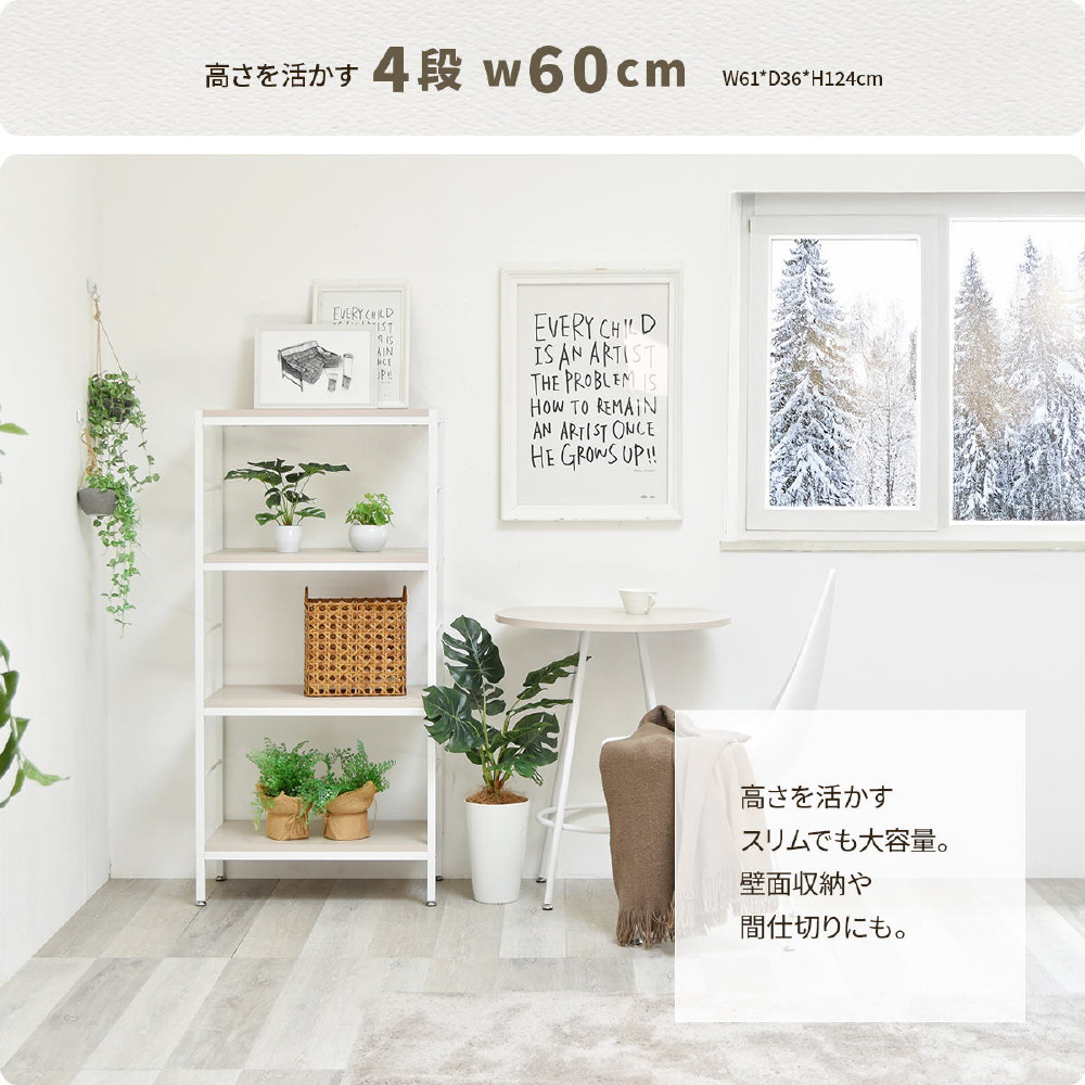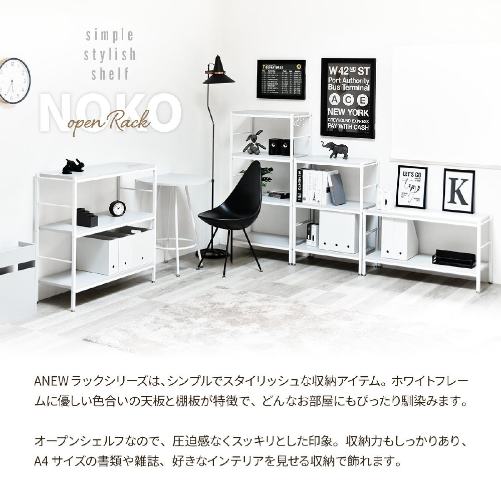 ホワイトフレームに柔らかいニュアンスカラーの天板、棚板が特徴的な、Nokoシリーズのラック。シンプルな構造でお部屋のの雰囲気を優しい印象にしてくれます。 壁面で使用するだけでなく空間の間仕切りとしても圧迫感なく活躍してくれます。収納スペースの高さは32cm。A4ファイルも収まる高さがあるので、雑誌なども立てて収納できます。