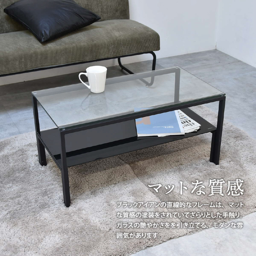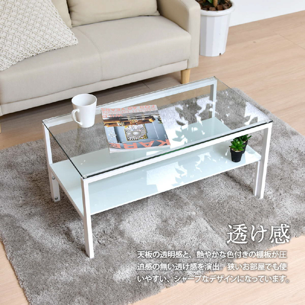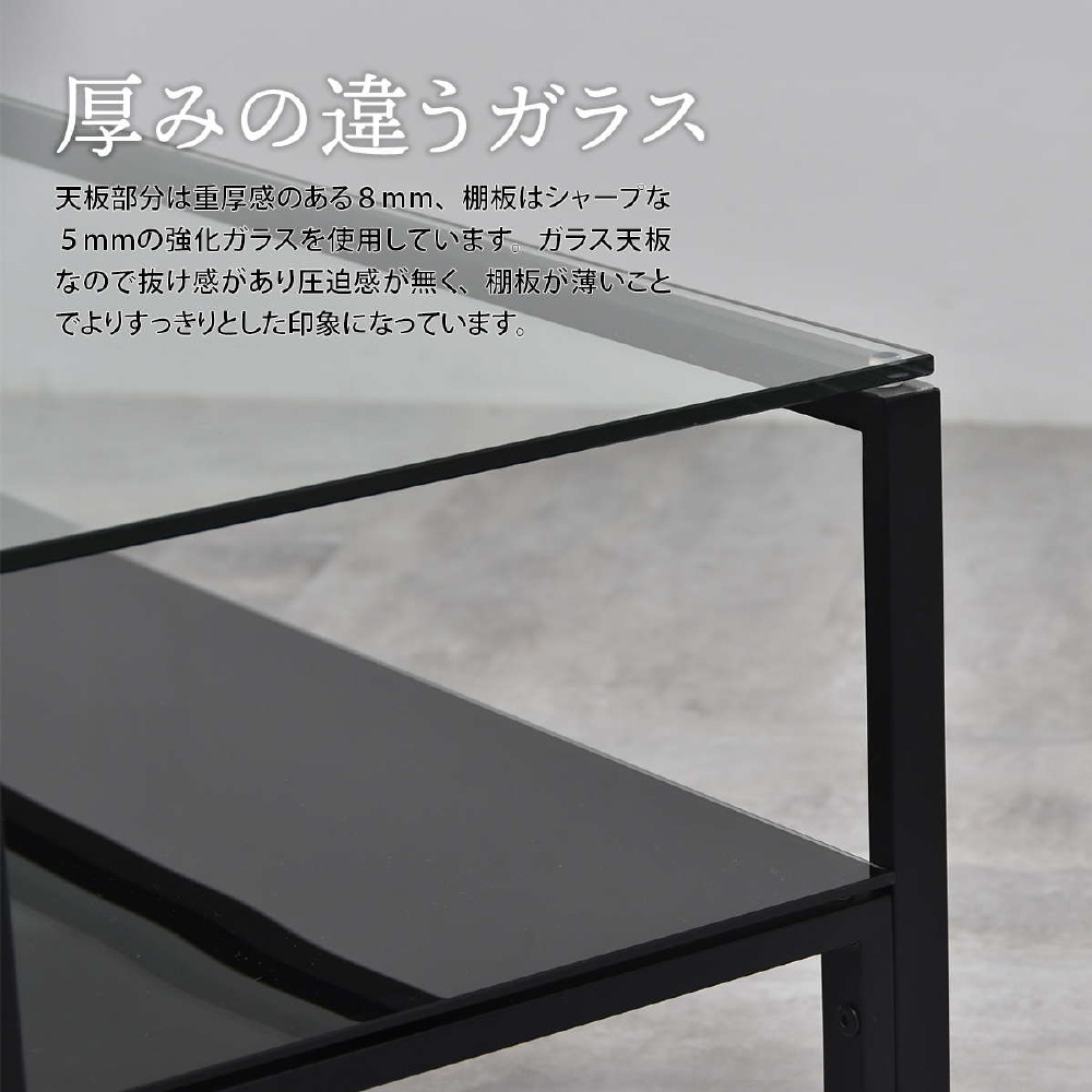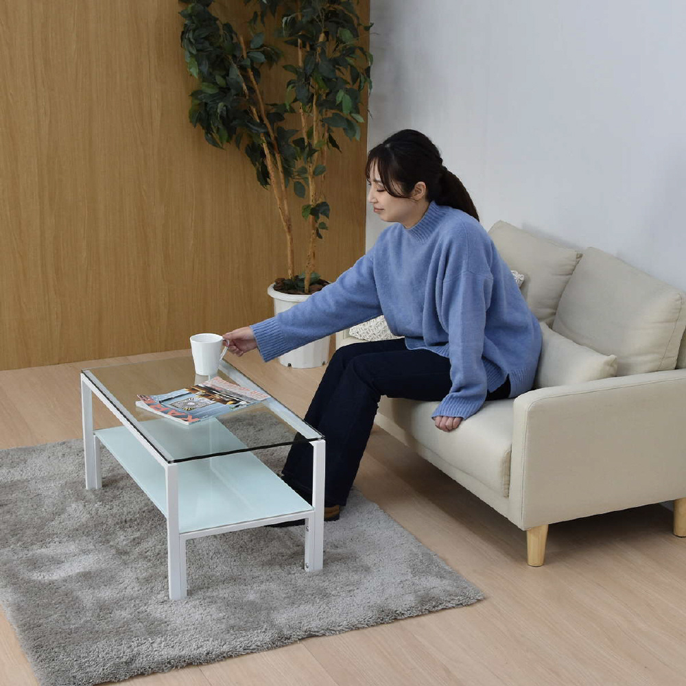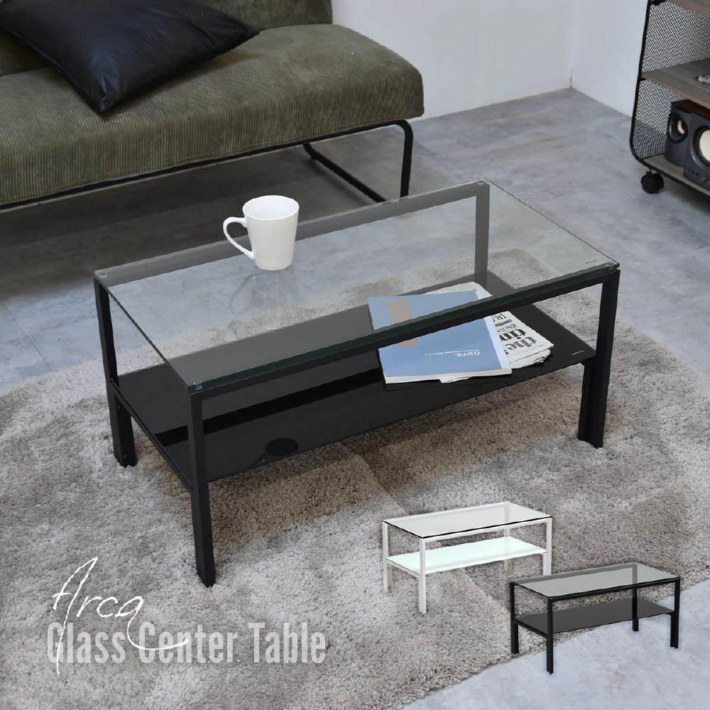 天板、棚板に強化ガラスを使用したシンプルなセンターテーブル。天板には透明なガラスを使用し圧迫感を軽減し、棚板にはブラック、ホワイトのガラスを使用する事でインテリア性を高め、フレームには長方形のパイプを使用しておりますのでシンプルながらもアクセントを効かせたデザインとなっています。棚板の上にお気に入りのアイテムをディスプレイしてコレクションテーブルのような使い方も可能です。
