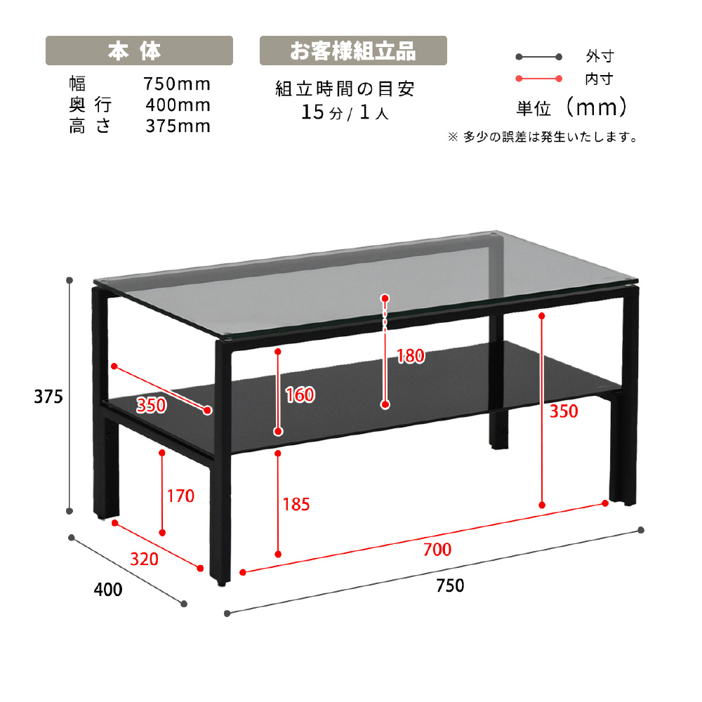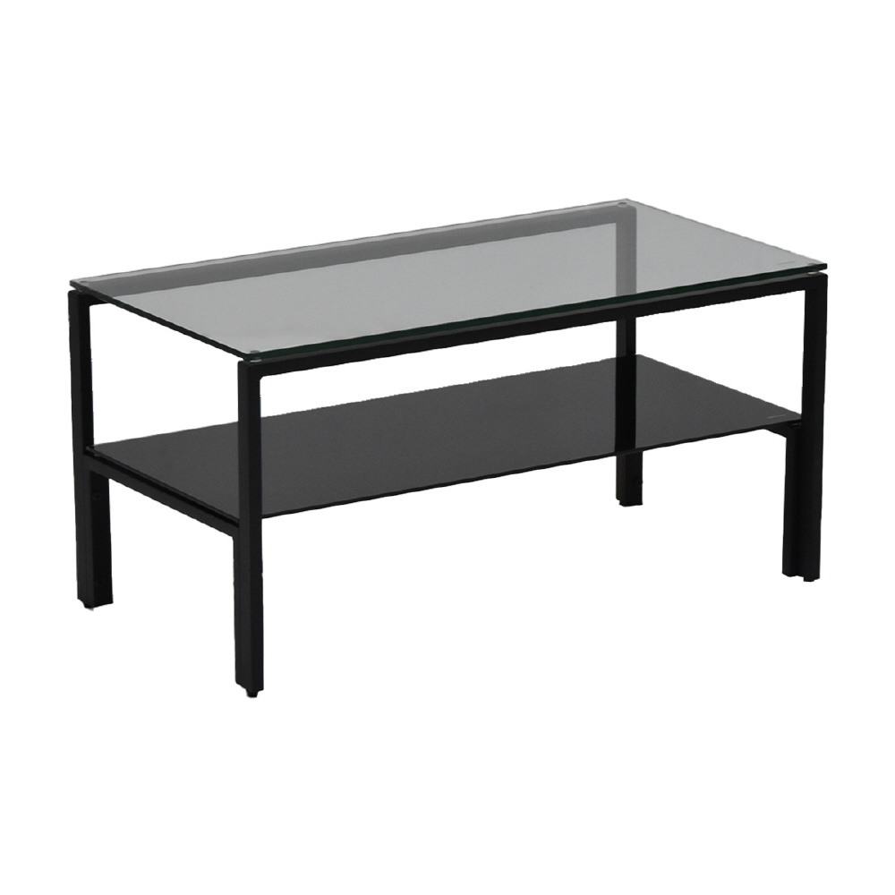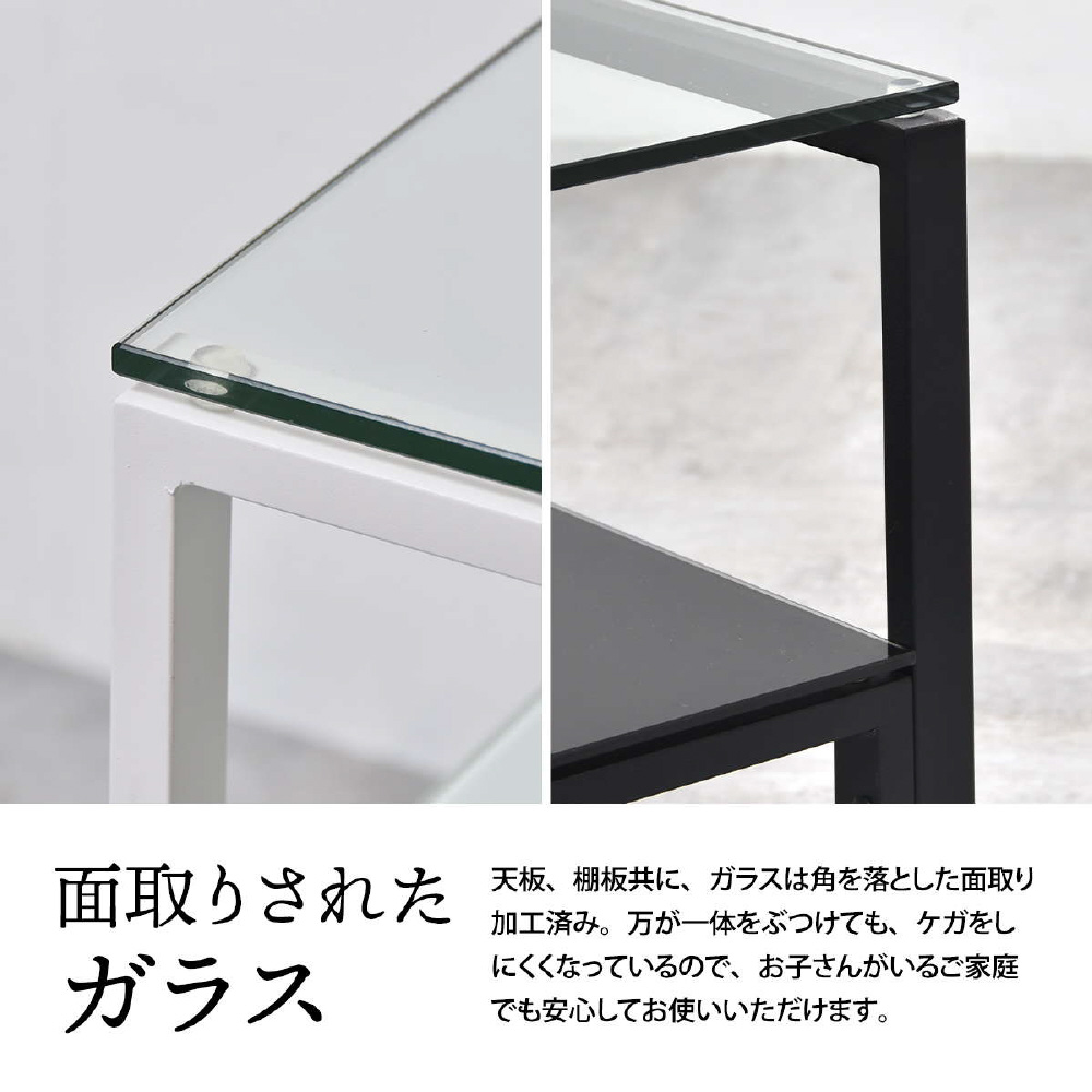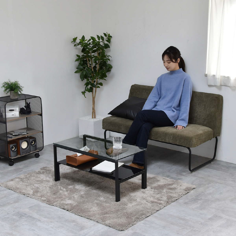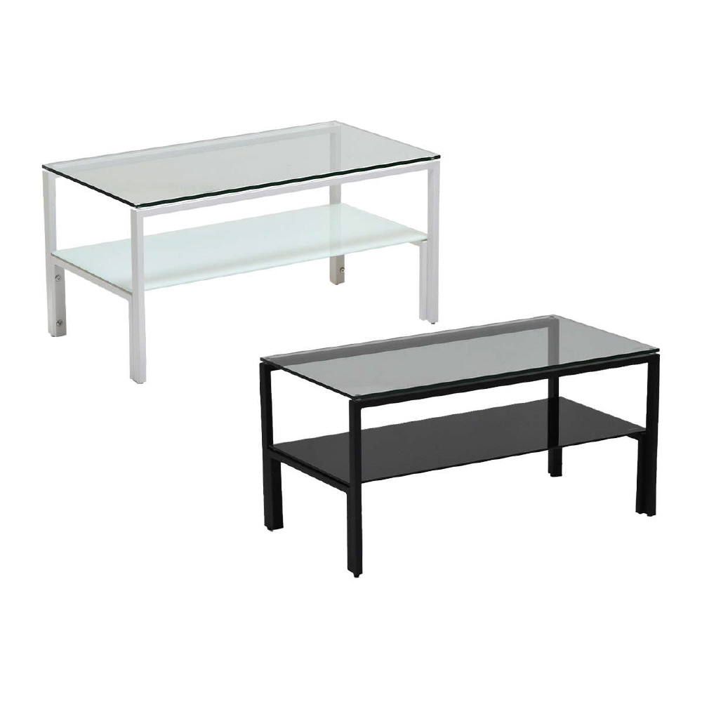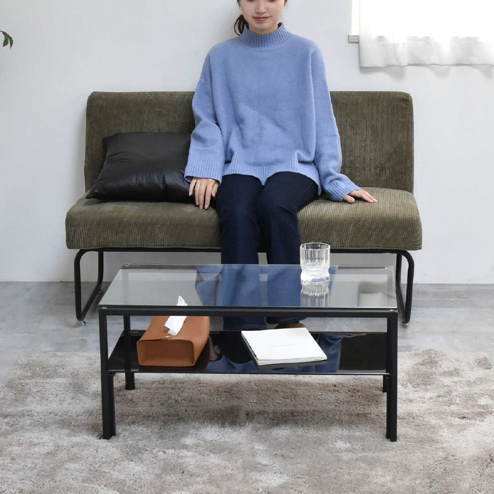 天板、棚板に強化ガラスを使用したシンプルなセンターテーブル。天板には透明なガラスを使用し圧迫感を軽減し、棚板にはブラック、ホワイトのガラスを使用する事でインテリア性を高め、フレームには長方形のパイプを使用しておりますのでシンプルながらもアクセントを効かせたデザインとなっています。棚板の上にお気に入りのアイテムをディスプレイしてコレクションテーブルのような使い方も可能です。