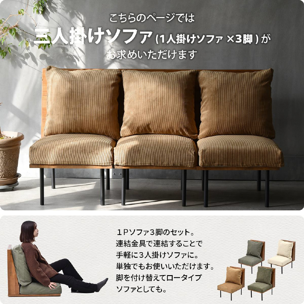 古材の様なエイジング加工を施した天然木をふんだんに使いブルックリンスタイルに仕上げたインフィニティーシリーズの1Pソファ3脚セット。連結金具を使用してつながる事ができるので、お部屋のサイズ感やレイアウトに合わせた組み合わせる事で、お好みの形のソファーにカスタマイズする事ができます。また脚を外して付属のアジャスターに付け替えることでロータイプのソファーとしてもご使用いただける仕様になっています。