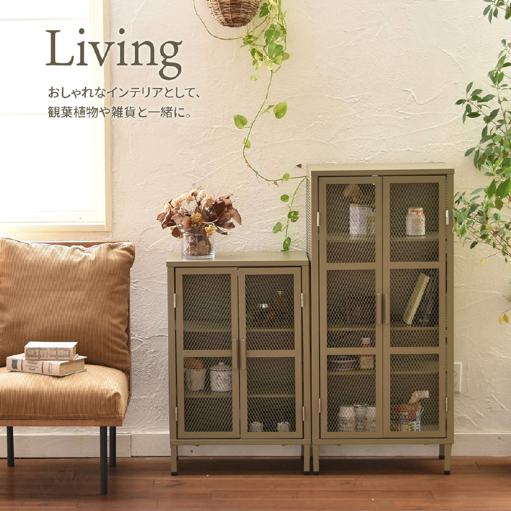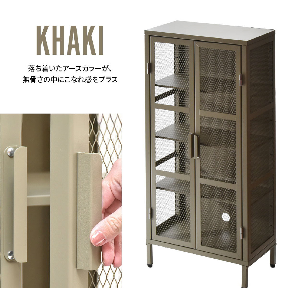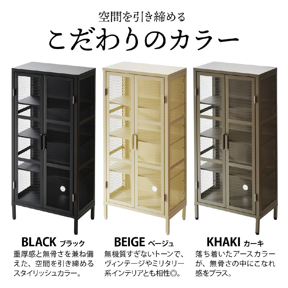 アメリカンビンテージをイメージして作られたメッシュキャビネットシリーズです。カラーは高級感のあるブラック、ポップなベージュ、おしゃれなカーキの3色から選べます。前扉だけでなく、側板もメッシュのスチール板を使う事で抜け感が演出され、コレクションケースの様な使い方もできるので、趣味のグッズを飾るととってもおしゃれになります。