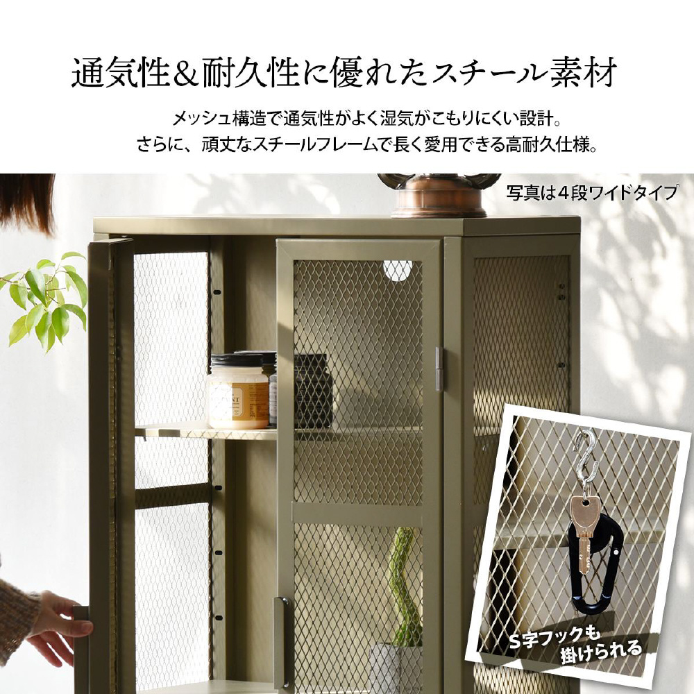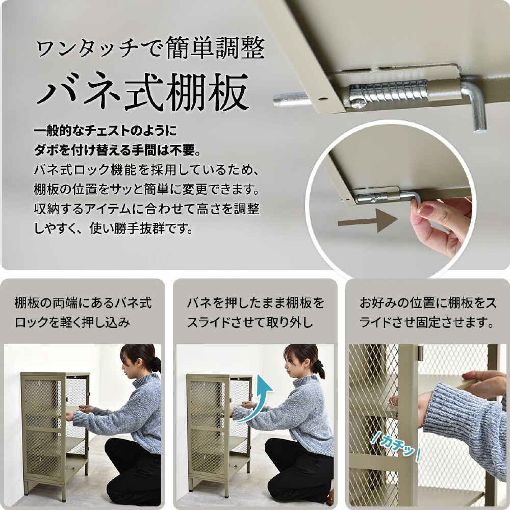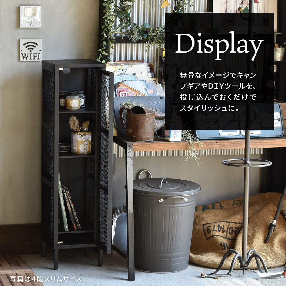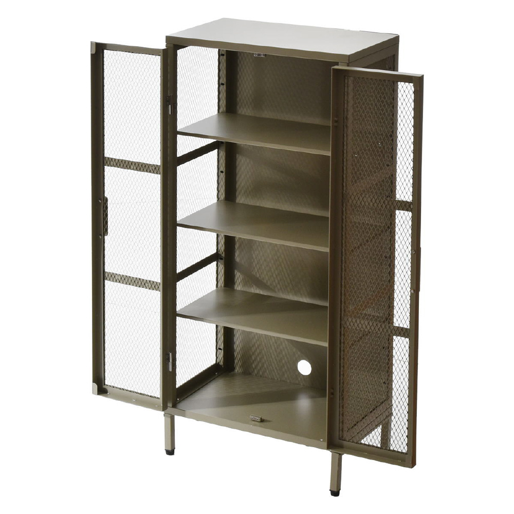 アメリカンビンテージをイメージして作られたメッシュキャビネットシリーズです。カラーは高級感のあるブラック、ポップなベージュ、おしゃれなカーキの3色から選べます。前扉だけでなく、側板もメッシュのスチール板を使う事で抜け感が演出され、コレクションケースの様な使い方もできるので、趣味のグッズを飾るととってもおしゃれになります。