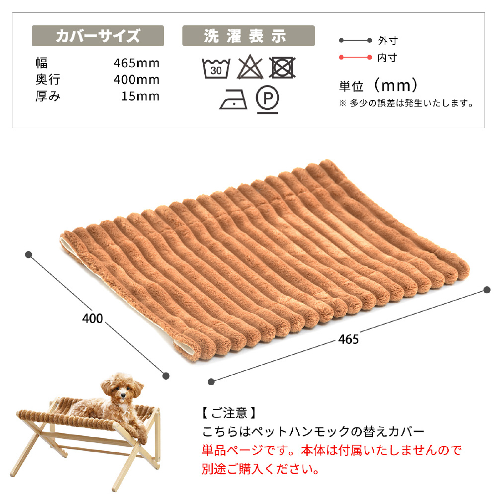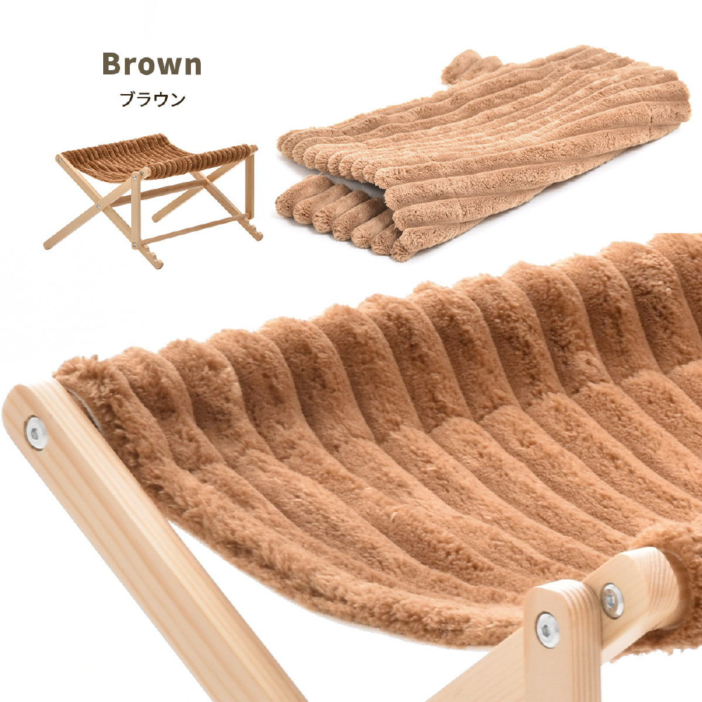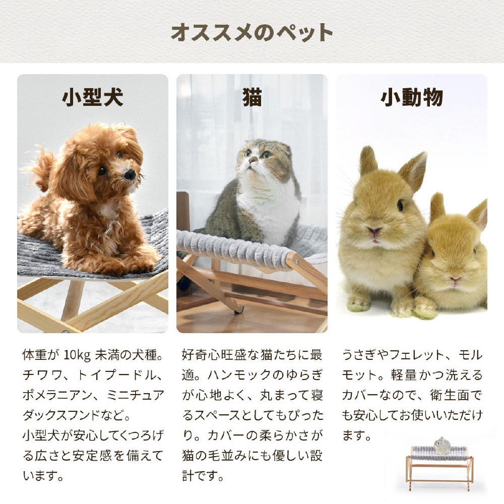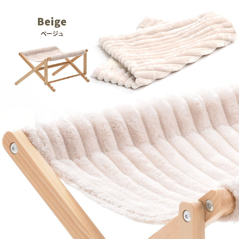 折りたたみペットハンモック Mofcotは、折りたたんで持ち運びのできるペット用の簡易ベッドです。フレームにはパインの天然木を使用し、カバー部分の表面には毛足の長い肌触りの良い生地、裏面にはさらりとした肌触りのしっかりめの生地を使用しております。カバーは汚れても洗濯可能ですし、万が一ベースが破損したり、カバーが破れてしまっても、それぞれ単品での販売もしておりますので長く使っていただけます。