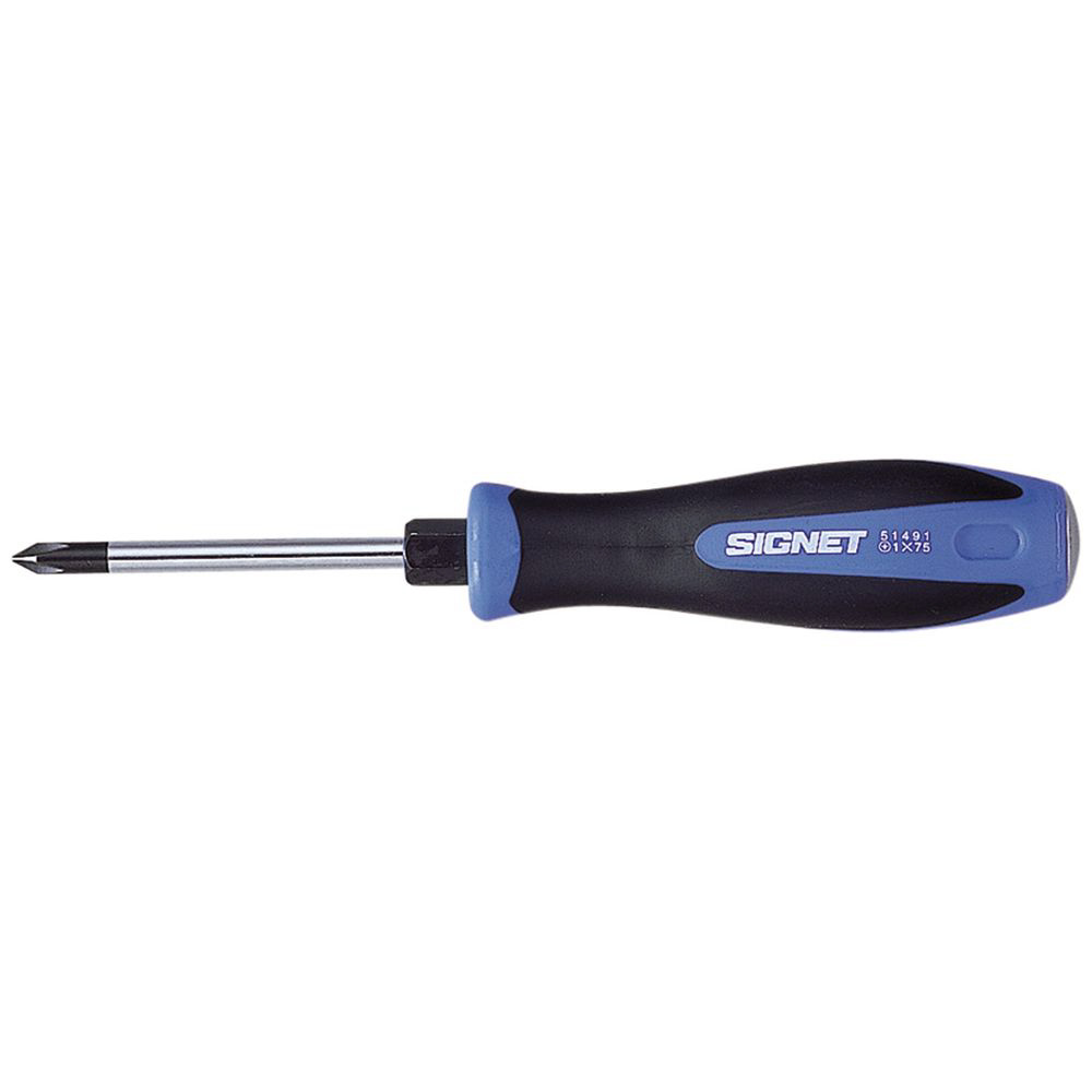 プラスドライバー。疲労感が少なく、握りやすいエルゴノミックハンドル。ブレード根元に六角部がありレンチをかけて回す事ができる。貫通タイプで、グリップエンドには打撃部があるので、固着したネジを外す際に最適。