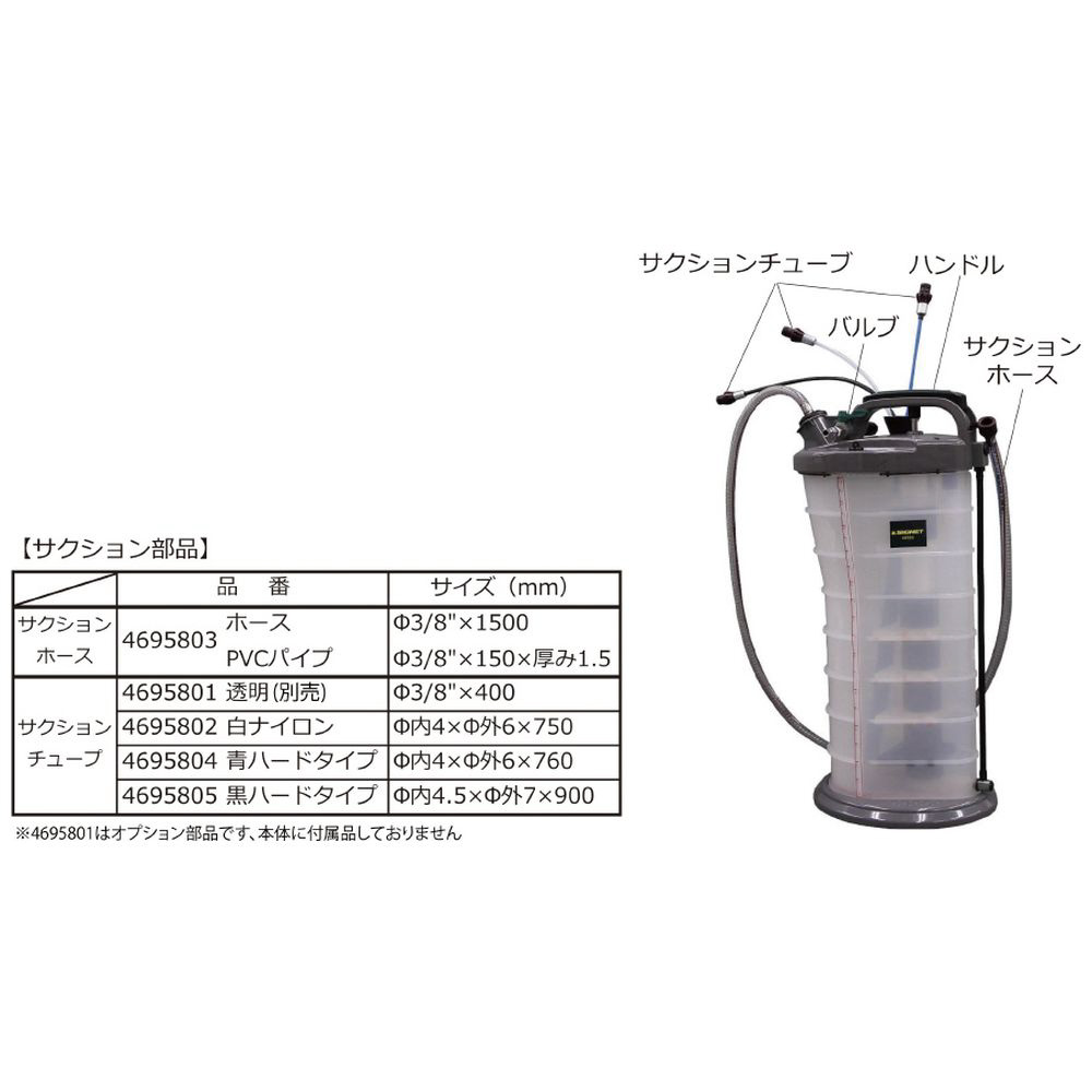 ・サクションチューブ(透明、4695801別売): φ3/8″×400(材質: ポリウレタン・スチール)