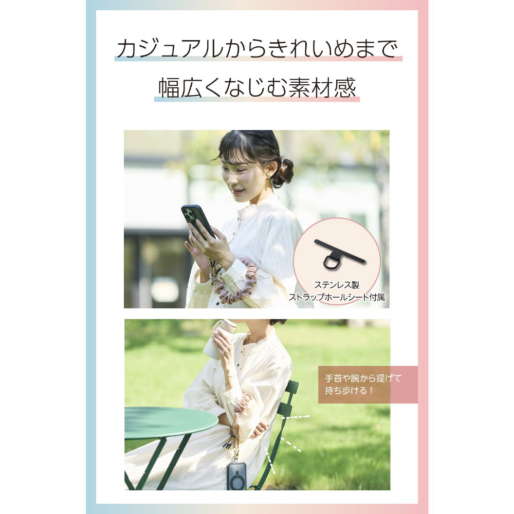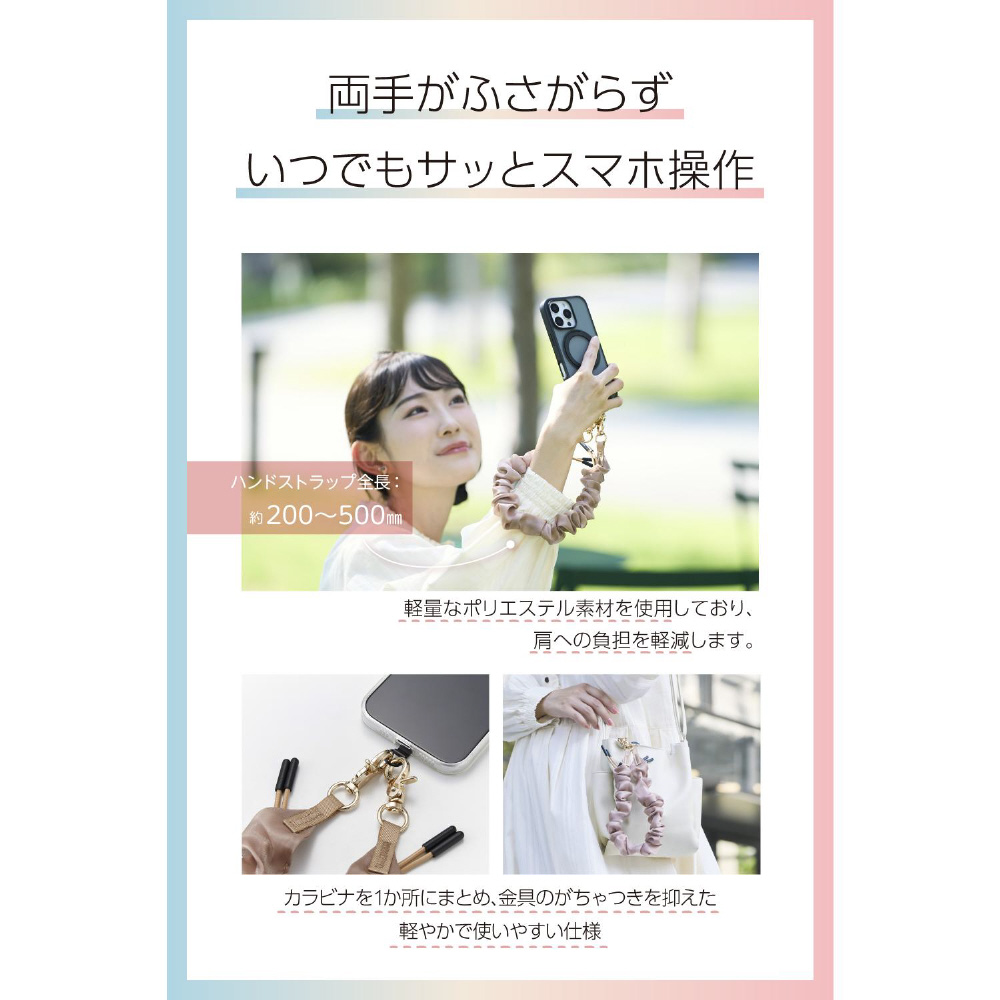 手首や腕から提げて持ち歩けるので、両手がふさがらずいつでもサッとスマートフォンの操作ができます。
