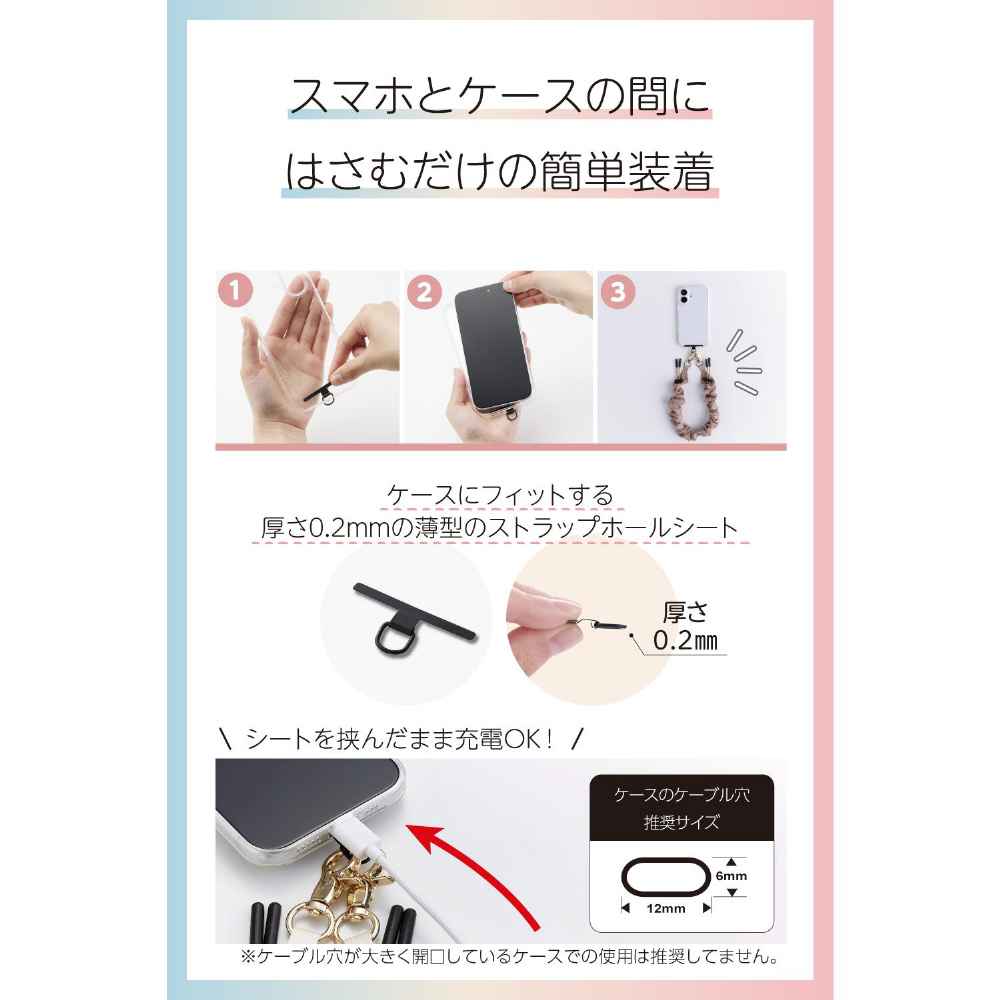 ケースにストラップホールがなくても、付属のストラップホールシートをスマートフォンとケースの間に挟むだけで使用でき、取り外しも簡単です。