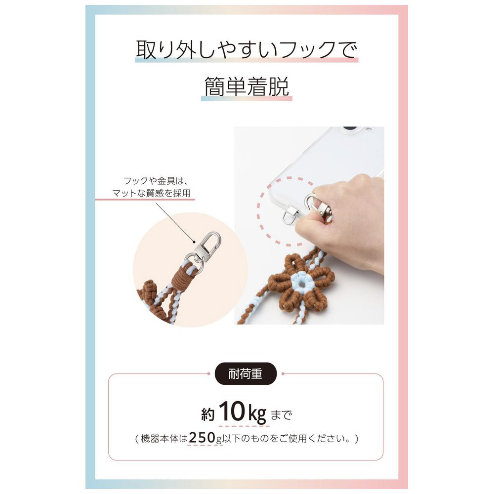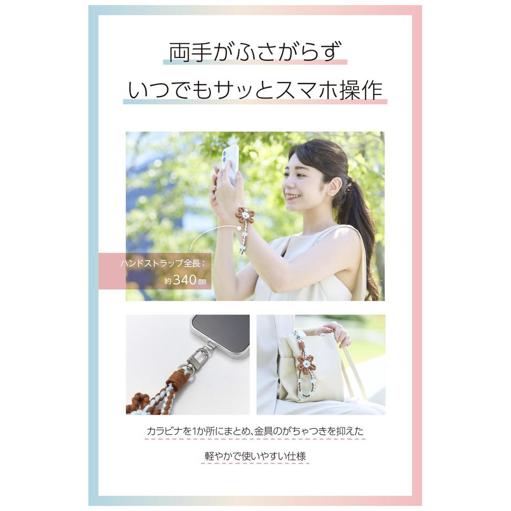 手元にやさしくなじむ綿素材に、お花のモチーフが映える華やかなアクセントを添えたハンドストラップです。手首や腕から提げて持ち歩けるので、両手がふさがらずいつでもサッとスマートフォンの操作ができます。カラビナは1か所のみの軽量仕様で、アクセサリー感覚で気軽に使えます。