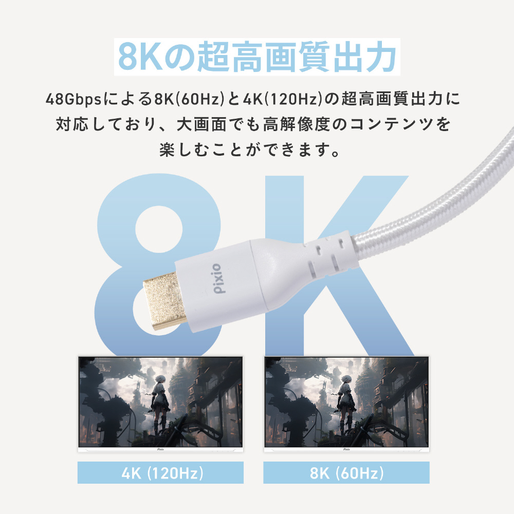 48Gbpsによる8K(60Hz)と4K(120Hz)の超高画質出力に対応しており、大画面でも高解像度のコンテンツを楽しむことができます。