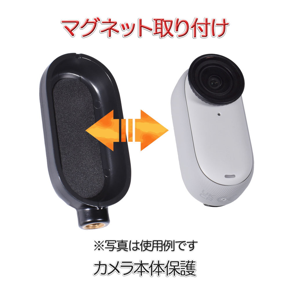 Insta360?GO3・GO3Sを傷や衝撃から守るマグネット式の保護ブラケット。1/4インチネジ穴付きで、自撮り棒や三脚などのアクセサリーにも対応。