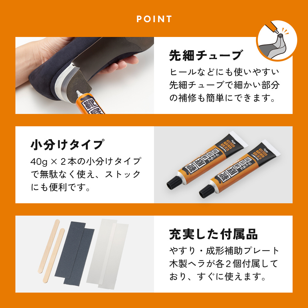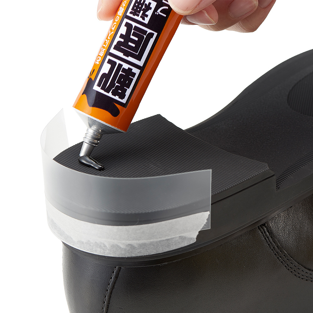 革靴だけでなく、ソールが黒いスニーカーなどのスポーツシューズにも対応。先細チューブで細かい部分の補修もラクラクです。