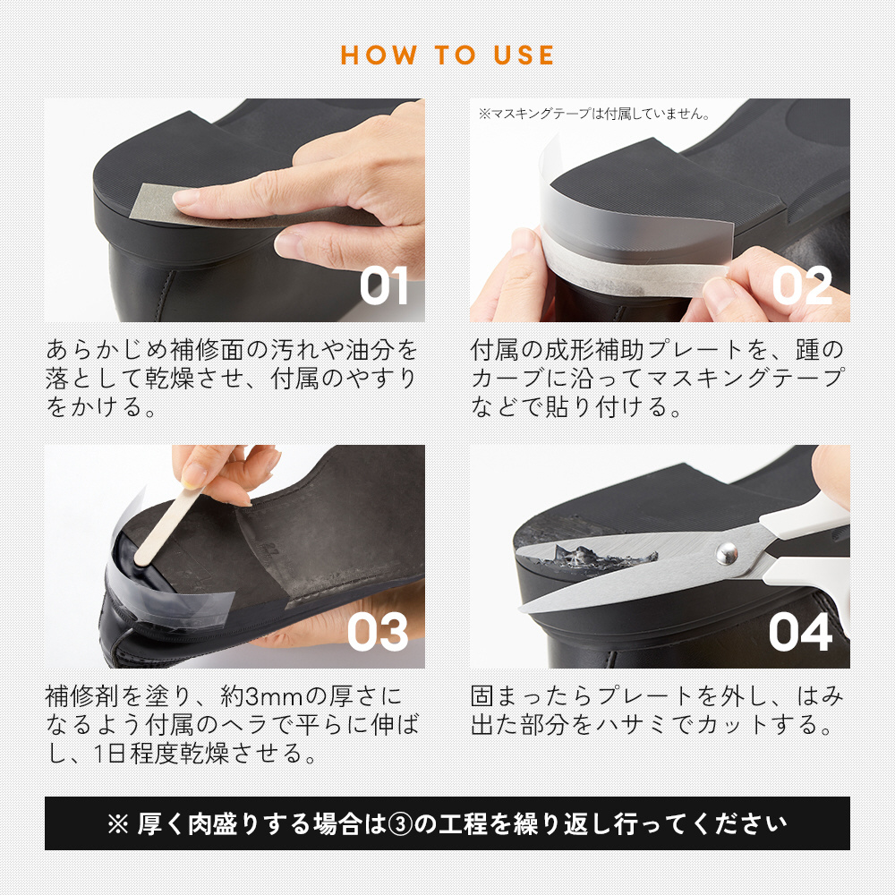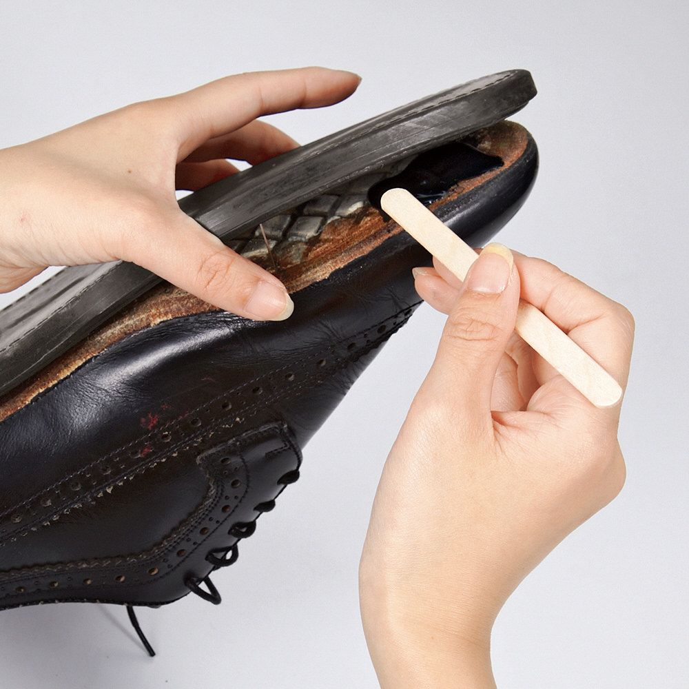はがれの補修は、両面に薄く伸ばして5?10分乾かし、強く張り合わせて1日乾燥させるだけ。大事な靴を捨てる前に、ぜひお試しください。