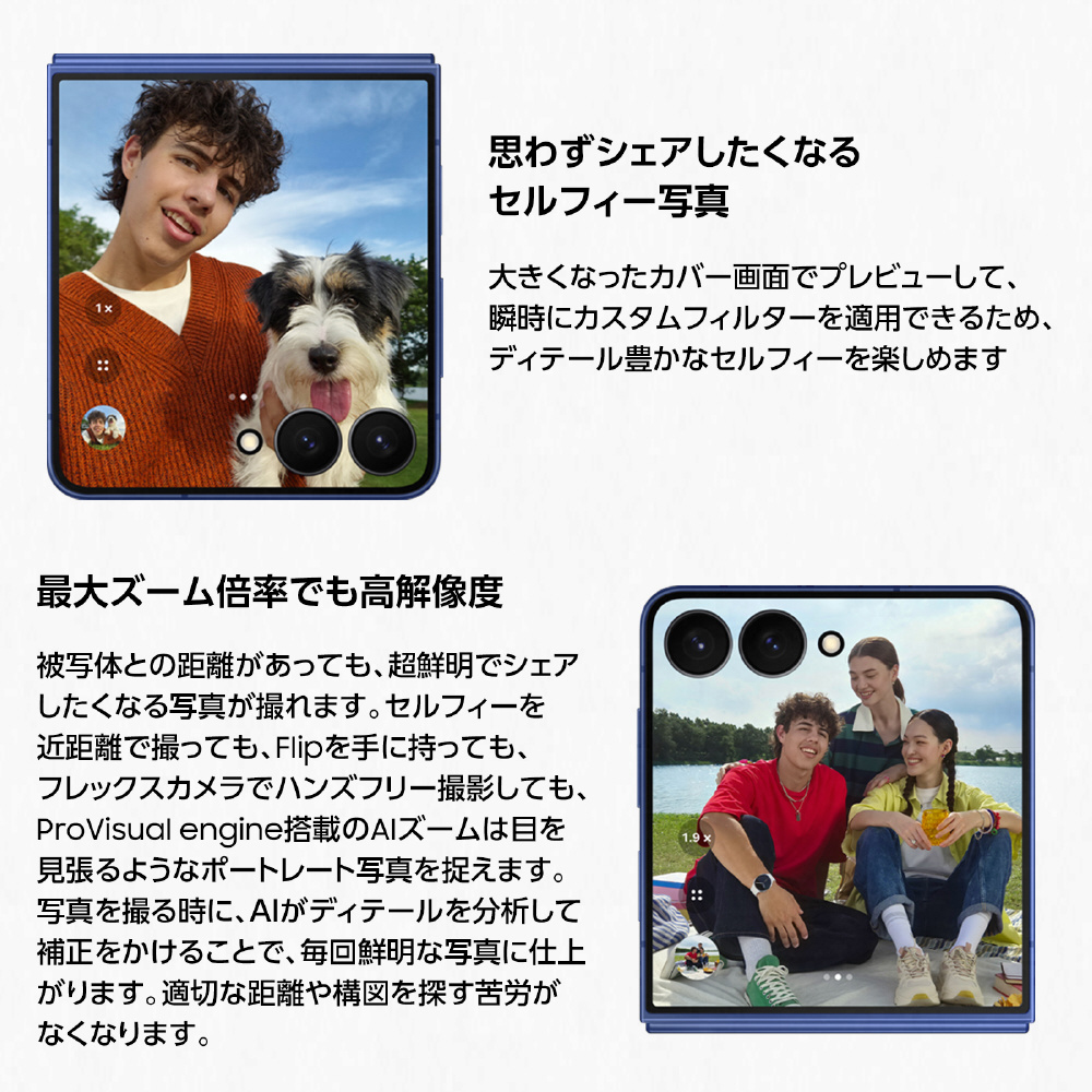 「Samsung Galaxy Z Flip7」の新しいカバー画面はコンテンツを画面の端から端まで美しく表示し、必要な情報を手元で即座に確認できます。これにより簡単なメッセージ入力、一目でスケジュール確認、そして高画質のセルフィー撮影をいつでも行うことができます。これまでで最も明るい「Samsung Galaxy Z Flip7」のカバー画面はスムーズなリフレッシュレートを実現し、すべてが鮮やかに、そして流れるように滑らかに表示されます。晴れた日の屋外であっても、SNSのフィードも快適にスクロールできます。