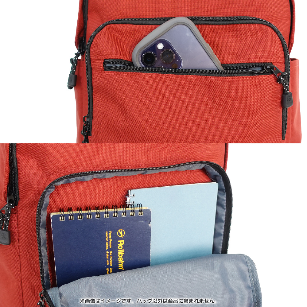 アクセスに便利な二層にわかれたフロントのポケットは小物類の整理に◎