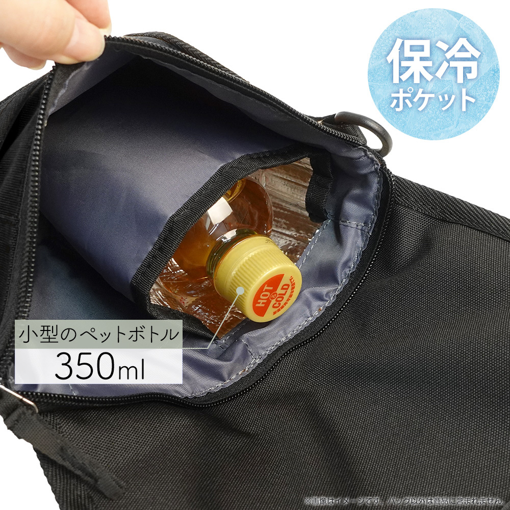 小型ペットボトルなどの飲料類を収納できる保冷ポケットを装備し、夏場の熱中症対策にも役立ちます。