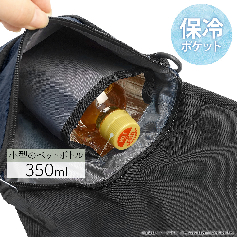 小型ペットボトルなどの飲料類を収納できる保冷ポケットを装備し、夏場の熱中症対策にも役立ちます。