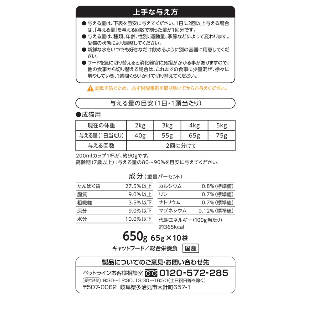 この製品は、ペットフード公正取引協議会の定める分析試験の結果、「総合栄養食/成猫期用」の基準を満たすことが証明されています。■4種類のかわいい粒 合成着色料不使用■こだわりのトッピングを採用◇銘柄鶏&花かつお節、銘柄鶏&まぐろ節■使いやすい新鮮小分けパック 65g×10袋■下部尿路の健康維持に配慮◇マグネシウム含有量調整 0.12%(標準値)
