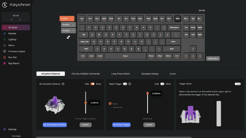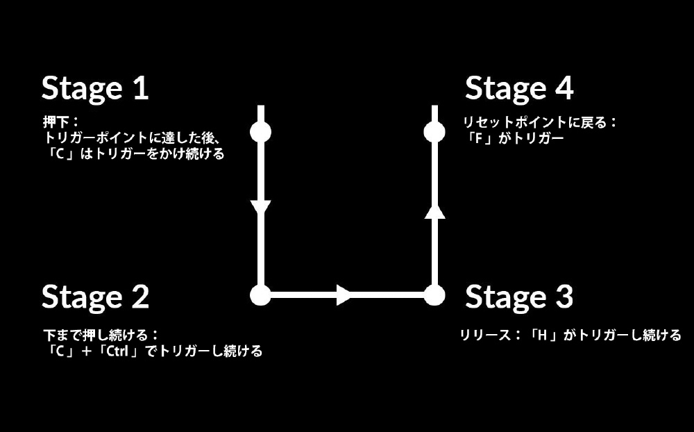 キーを押す深さに応じて、1つのキーに4つのアクションを割り当てることができます。例えば、ゲーム中にキーを軽く押すと前に歩き、深く押すと走る。さらに、キーを離すことで2段階の設定にも対応。これにより、よりスムーズでパーソナライズされた組み合わせが可能になり、対戦ゲームで優位に立つことができます。